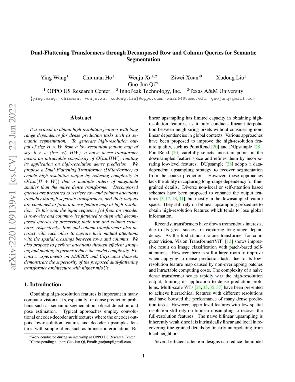 It is critical to obtain high resolution features with long range dependency for dense prediction tasks such as semantic segmentation. To generate high-resolution output of size from a low-resolution feature map of size (), a naive dense transformer incurs an intractable complexity of , limiting its application on high-resolution dense prediction. We propose a Dual-Flattening Transformer (DFlatFormer) to enable high-resolution output by reducing complexity to that is multiple orders of magnitude smaller than the naive dense transformer. Decomposed queries are presented to retrieve row and column attentions tractably through separate transformers, and their outputs are combined to form a dense feature map at high resolution. To this end, the input sequence fed from an encoder is row-wise and column-wise flattened to align with decomposed queries by preserving their row and column structures, respectively. Row and column transformers also interact with each other to capture their mutual attentions with the spatial crossings between rows and columns. We also propose to perform attentions through efficient grouping and pooling to further reduce the model complexity. Extensive experiments on ADE20K and Cityscapes datasets demonstrate the superiority of the proposed dual-flattening transformer architecture with higher mIoUs.