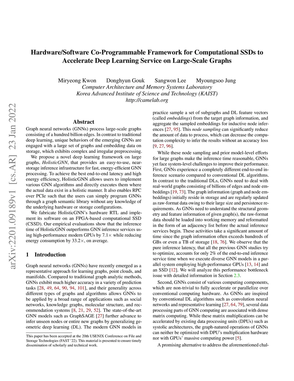 Graph neural networks (GNNs) process large-scale graphs consisting of a hundred billion edges. In contrast to traditional deep learning, unique behaviors of the emerging GNNs are engaged with a large set of graphs and embedding data on storage, which exhibits complex and irregular preprocessing. We propose a novel deep learning framework on large graphs, HolisticGNN, that provides an easy-to-use, near-storage inference infrastructure for fast, energy-efficient GNN processing. To achieve the best end-to-end latency and high energy efficiency, HolisticGNN allows users to implement various GNN algorithms and directly executes them where the actual data exist in a holistic manner. It also enables RPC over PCIe such that the users can simply program GNNs through a graph semantic library without any knowledge of the underlying hardware or storage configurations. We fabricate HolisticGNN's hardware RTL and implement its software on an FPGA-based computational SSD (CSSD). Our empirical evaluations show that the inference time of HolisticGNN outperforms GNN inference services using high-performance modern GPUs by 7.1x while reducing energy consumption by 33.2x, on average.