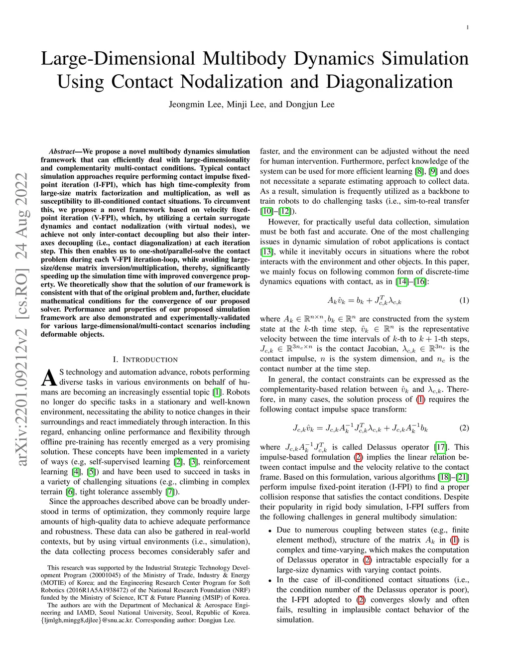 We propose a novel multibody dynamics simulation framework that can efficiently deal with large-dimensionality and complementarity multi-contact conditions. Typical contact simulation approaches perform contact impulse-level fixed-point iteration (IL-FPI), which has high time-complexity from large-size matrix inversion and multiplication, as well as susceptibility to ill-conditioned contact situations. To circumvent this, we propose a novel framework based on velocity-level fixed-point iteration (VL-FPI), which, by utilizing a certain surrogate dynamics and contact nodalization (with virtual nodes), can achieve not only inter-contact decoupling but also their inter-axes decoupling (i.e., contact diagonalization). This then enables us to one-shot/parallel-solve the contact problem during each VL-FPI iteration-loop, while the surrogate dynamics structure allows us to circumvent large-size/dense matrix inversion/multiplication, thereby, significantly speeding up the simulation time with improved convergence property. We theoretically show that the solution of our framework is consistent with that of the original problem and, further, elucidate mathematical conditions for the convergence of our proposed solver. Performance and properties of our proposed simulation framework are also demonstrated and experimentally-validated for various large-dimensional/multi-contact scenarios including deformable objects.