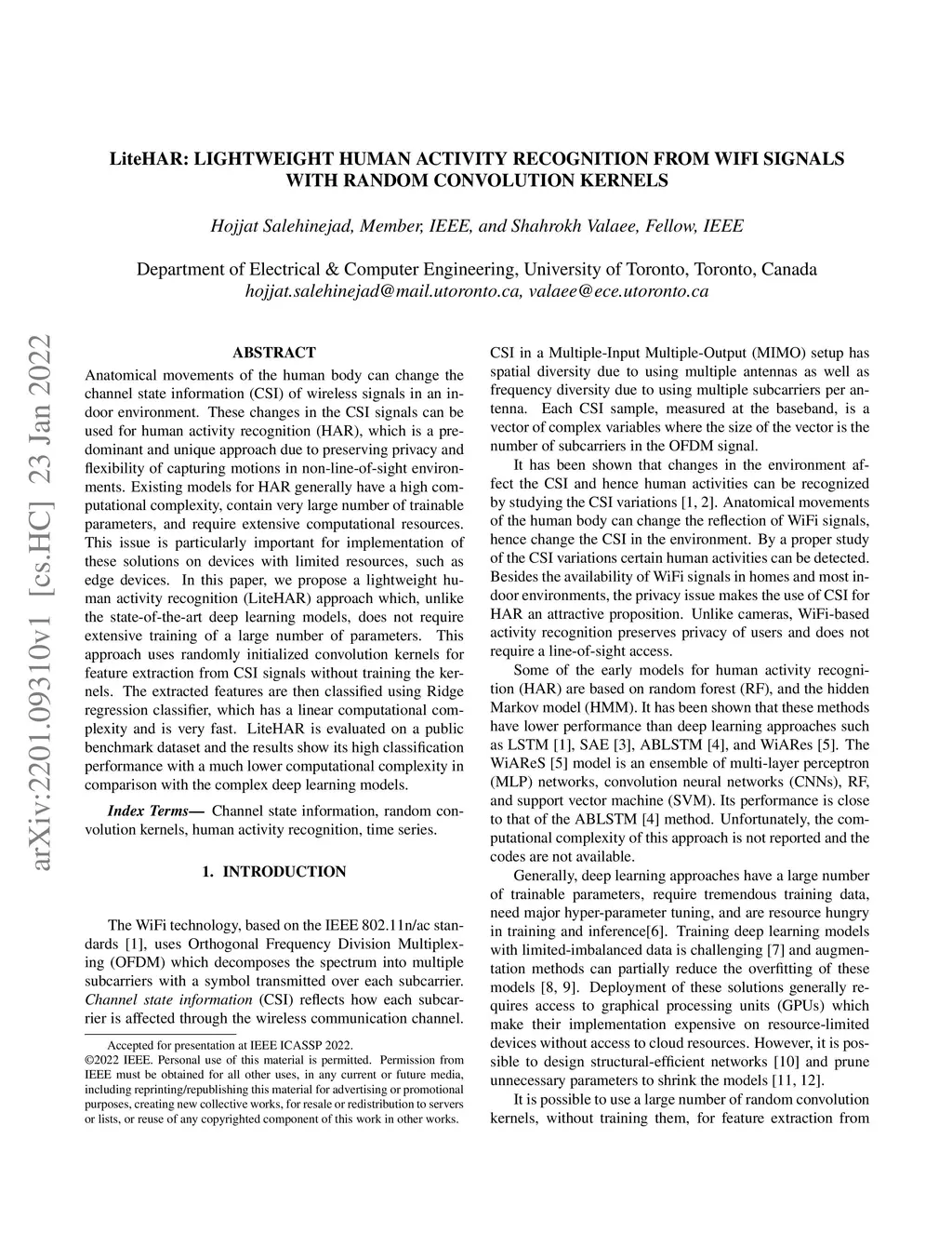 Anatomical movements of the human body can change the channel state information (CSI) of wireless signals in an indoor environment. These changes in the CSI signals can be used for human activity recognition (HAR), which is a predominant and unique approach due to preserving privacy and flexibility of capturing motions in non-line-of-sight environments. Existing models for HAR generally have a high computational complexity, contain very large number of trainable parameters, and require extensive computational resources. This issue is particularly important for implementation of these solutions on devices with limited resources, such as edge devices. In this paper, we propose a lightweight human activity recognition (LiteHAR) approach which, unlike the state-of-the-art deep learning models, does not require extensive training of large number of parameters. This approach uses randomly initialized convolution kernels for feature extraction from CSI signals without training the kernels. The extracted features are then classified using Ridge regression classifier, which has a linear computational complexity and is very fast. LiteHAR is evaluated on a public benchmark dataset and the results show its high classification performance in comparison with the complex deep learning models with a much lower computational complexity.