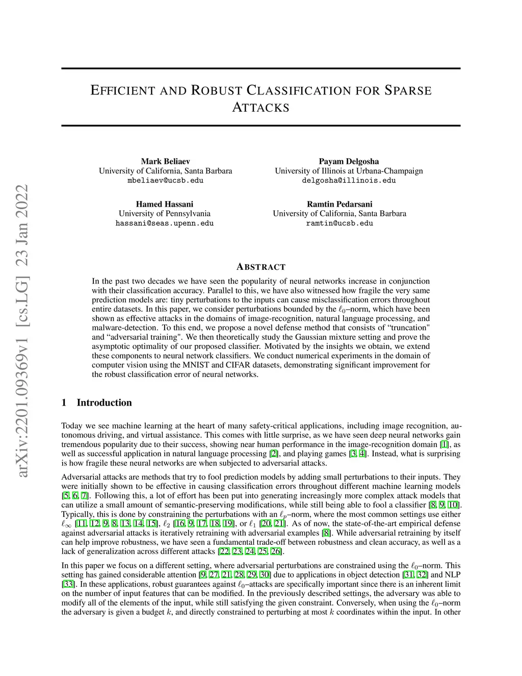 In the past two decades we have seen the popularity of neural networks increase in conjunction with their classification accuracy. Parallel to this, we have also witnessed how fragile the very same prediction models are: tiny perturbations to the inputs can cause misclassification errors throughout entire datasets. In this paper, we consider perturbations bounded by the --norm, which have been shown as effective attacks in the domains of image-recognition, natural language processing, and malware-detection. To this end, we propose a novel defense method that consists of "truncation" and "adversarial training". We then theoretically study the Gaussian mixture setting and prove the asymptotic optimality of our proposed classifier. Motivated by the insights we obtain, we extend these components to neural network classifiers. We conduct numerical experiments in the domain of computer vision using the MNIST and CIFAR datasets, demonstrating significant improvement for the robust classification error of neural networks.