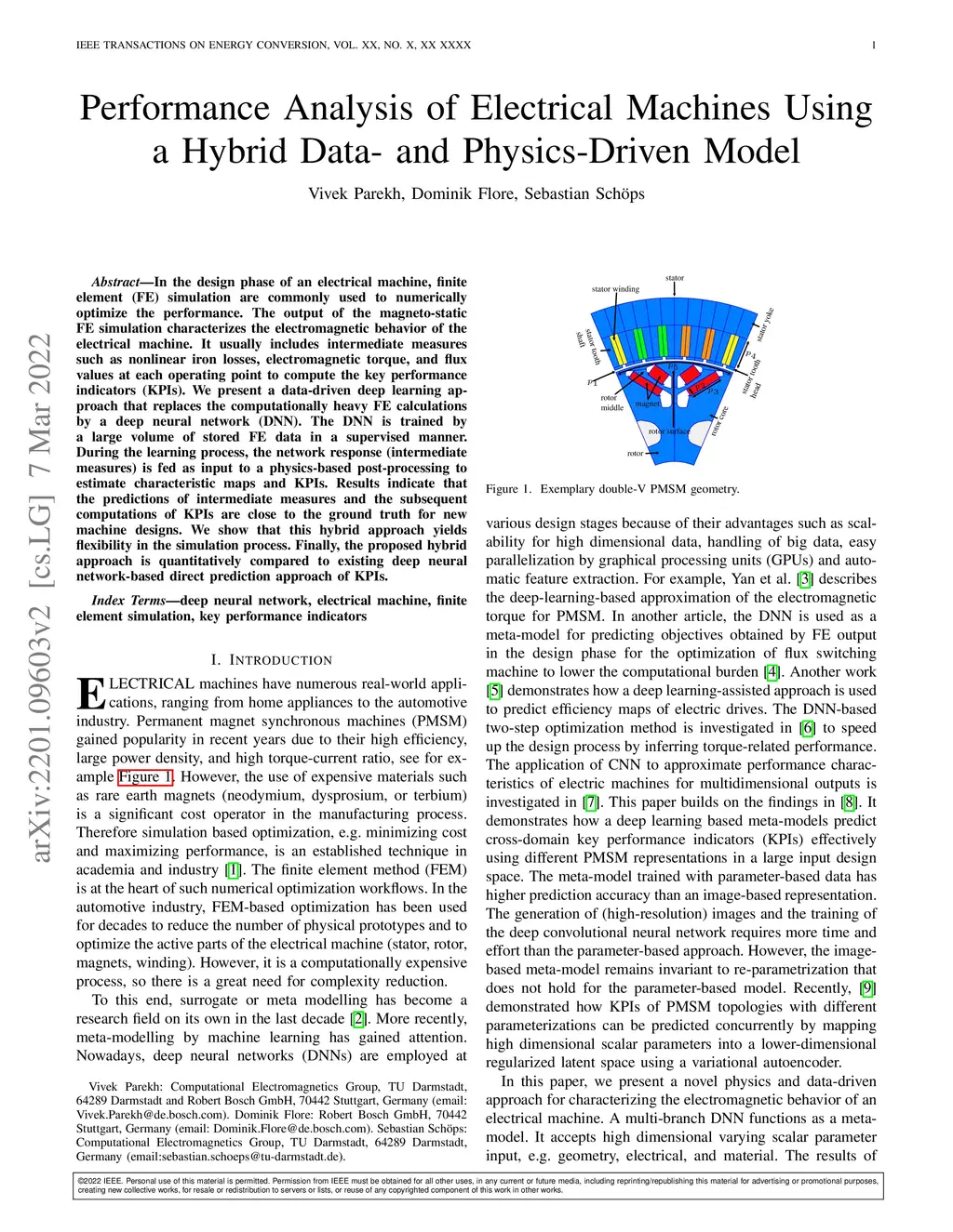 In the design phase of an electrical machine, finite element (FE) simulation are commonly used to numerically optimize the performance. The output of the magneto-static FE simulation characterizes the electromagnetic behavior of the electrical machine. It usually includes intermediate measures such as nonlinear iron losses, electromagnetic torque, and flux values at each operating point to compute the key performance indicators (KPIs). We present a data-driven deep learning approach that replaces the computationally heavy FE calculations by a deep neural network (DNN). The DNN is trained by a large volume of stored FE data in a supervised manner. During the learning process, the network response (intermediate measures) is fed as input to a physics-based post-processing to estimate characteristic maps and KPIs. Results indicate that the predictions of intermediate measures and the subsequent computations of KPIs are close to the ground truth for new machine designs. We show that this hybrid approach yields flexibility in the simulation process. Finally, the proposed hybrid approach is quantitatively compared to existing deep neural network-based direct prediction approach of KPIs.