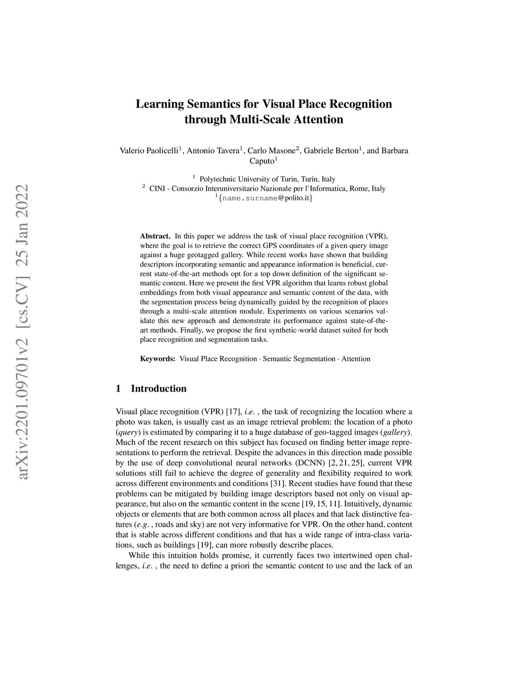 In this paper we address the task of visual place recognition (VPR), where the goal is to retrieve the correct GPS coordinates of a given query image against a huge geotagged gallery. While recent works have shown that building descriptors incorporating semantic and appearance information is beneficial, current state-of-the-art methods opt for a top down definition of the significant semantic content. Here we present the first VPR algorithm that learns robust global embeddings from both visual appearance and semantic content of the data, with the segmentation process being dynamically guided by the recognition of places through a multi-scale attention module. Experiments on various scenarios validate this new approach and demonstrate its performance against state-of-the-art methods. Finally, we propose the first synthetic-world dataset suited for both place recognition and segmentation tasks.