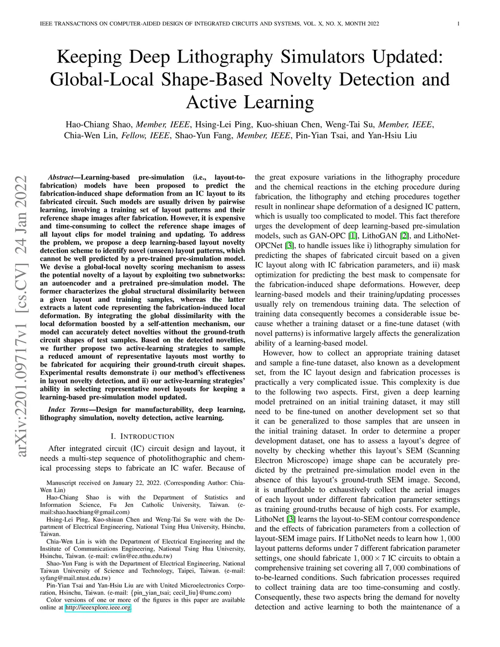Learning-based pre-simulation (i.e., layout-to-fabrication) models have been proposed to predict the fabrication-induced shape deformation from an IC layout to its fabricated circuit. Such models are usually driven by pairwise learning, involving a training set of layout patterns and their reference shape images after fabrication. However, it is expensive and time-consuming to collect the reference shape images of all layout clips for model training and updating. To address the problem, we propose a deep learning-based layout novelty detection scheme to identify novel (unseen) layout patterns, which cannot be well predicted by a pre-trained pre-simulation model. We devise a global-local novelty scoring mechanism to assess the potential novelty of a layout by exploiting two subnetworks: an autoencoder and a pretrained pre-simulation model. The former characterizes the global structural dissimilarity between a given layout and training samples, whereas the latter extracts a latent code representing the fabrication-induced local deformation. By integrating the global dissimilarity with the local deformation boosted by a self-attention mechanism, our model can accurately detect novelties without the ground-truth circuit shapes of test samples. Based on the detected novelties, we further propose two active-learning strategies to sample a reduced amount of representative layouts most worthy to be fabricated for acquiring their ground-truth circuit shapes. Experimental results demonstrate i) our method's effectiveness in layout novelty detection, and ii) our active-learning strategies' ability in selecting representative novel layouts for keeping a learning-based pre-simulation model updated.