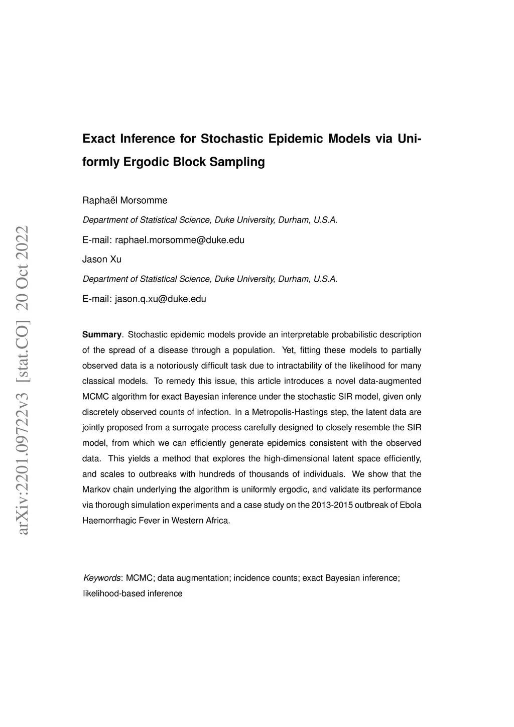 Exact Inference for Stochastic Epidemic Models via Uniformly Ergodic
