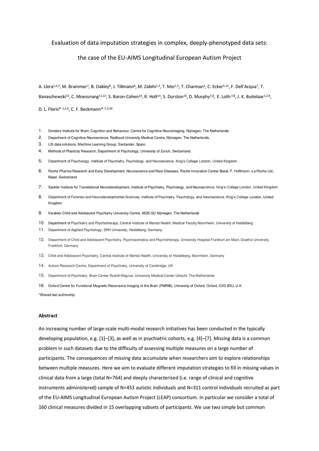 An increasing number of large-scale multi-modal research initiatives has been conducted in the typically developing population, as well as in psychiatric cohorts. Missing data is a common problem in such datasets due to the difficulty of assessing multiple measures on a large number of participants. The consequences of missing data accumulate when researchers aim to explore relationships between multiple measures. Here we aim to evaluate different imputation strategies to fill in missing values in clinical data from a large (total N=764) and deeply characterised (i.e. range of clinical and cognitive instruments administered) sample of N=453 autistic individuals and N=311 control individuals recruited as part of the EU-AIMS Longitudinal European Autism Project (LEAP) consortium. In particular we consider a total of 160 clinical measures divided in 15 overlapping subsets of participants. We use two simple but common univariate strategies, mean and median imputation, as well as a Round Robin regression approach involving four independent multivariate regression models including a linear model, Bayesian Ridge regression, as well as several non-linear models, Decision Trees, Extra Trees and K-Neighbours regression. We evaluate the models using the traditional mean square error towards removed available data, and consider in addition the KL divergence between the observed and the imputed distributions. We show that all of the multivariate approaches tested provide a substantial improvement compared to typical univariate approaches. Further, our analyses reveal that across all 15 data-subsets tested, an Extra Trees regression approach provided the best global results. This allows the selection of a unique model to impute missing data for the LEAP project and deliver a fixed set of imputed clinical data to be used by researchers working with the LEAP dataset in the future.