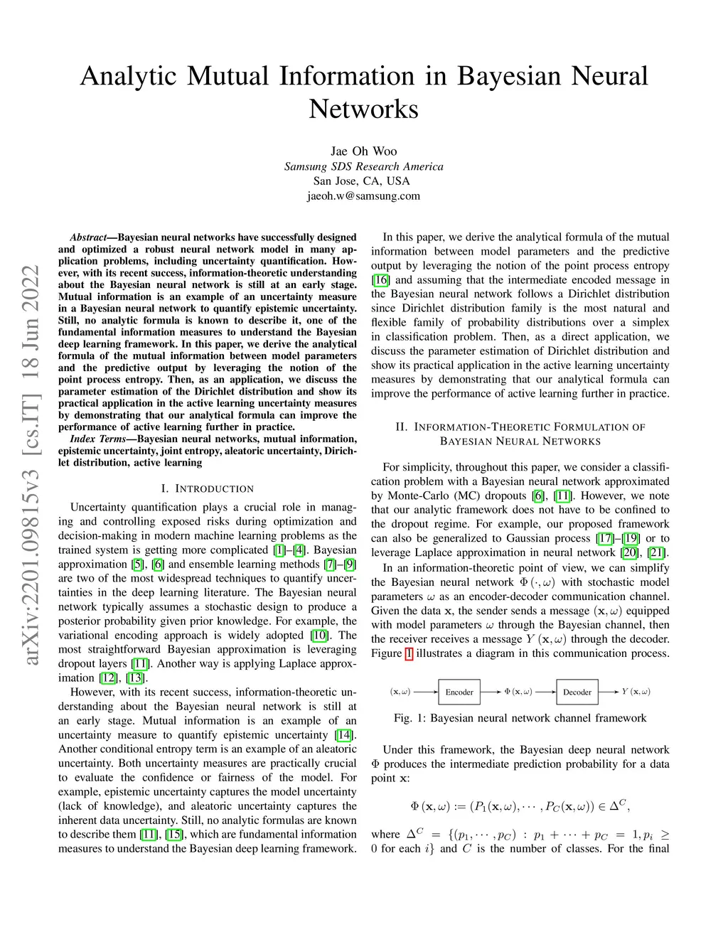 Bayesian neural networks have successfully designed and optimized a robust neural network model in many application problems, including uncertainty quantification. However, with its recent success, information-theoretic understanding about the Bayesian neural network is still at an early stage. Mutual information is an example of an uncertainty measure in a Bayesian neural network to quantify epistemic uncertainty. Still, no analytic formula is known to describe it, one of the fundamental information measures to understand the Bayesian deep learning framework. In this paper, we derive the analytical formula of the mutual information between model parameters and the predictive output by leveraging the notion of the point process entropy. Then, as an application, we discuss the parameter estimation of the Dirichlet distribution and show its practical application in the active learning uncertainty measures by demonstrating that our analytical formula can improve the performance of active learning further in practice.
