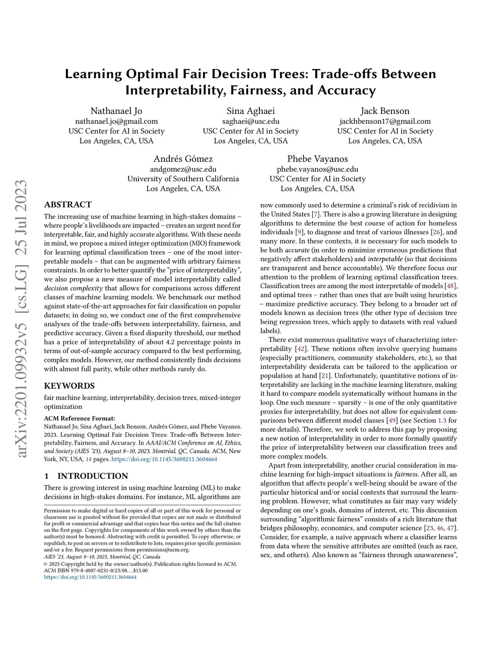 The increasing use of machine learning in high-stakes domains -- where people's livelihoods are impacted -- creates an urgent need for interpretable, fair, and highly accurate algorithms. With these needs in mind, we propose a mixed integer optimization (MIO) framework for learning optimal classification trees -- one of the most interpretable models -- that can be augmented with arbitrary fairness constraints. In order to better quantify the "price of interpretability", we also propose a new measure of model interpretability called decision complexity that allows for comparisons across different classes of machine learning models. We benchmark our method against state-of-the-art approaches for fair classification on popular datasets; in doing so, we conduct one of the first comprehensive analyses of the trade-offs between interpretability, fairness, and predictive accuracy. Given a fixed disparity threshold, our method has a price of interpretability of about 4.2 percentage points in terms of out-of-sample accuracy compared to the best performing, complex models. However, our method consistently finds decisions with almost full parity, while other methods rarely do.