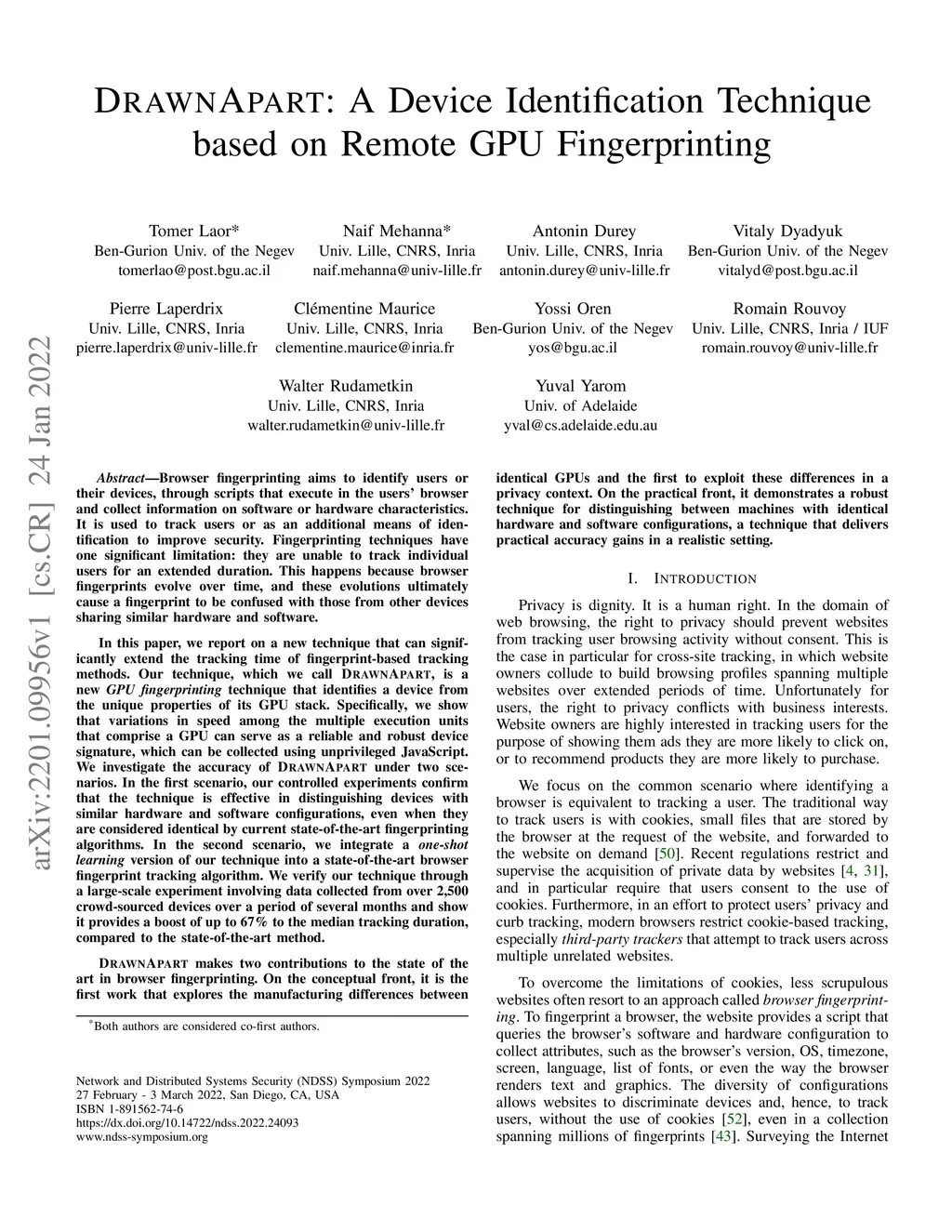 Browser fingerprinting aims to identify users or their devices, through scripts that execute in the users' browser and collect information on software or hardware characteristics. It is used to track users or as an additional means of identification to improve security. In this paper, we report on a new technique that can significantly extend the tracking time of fingerprint-based tracking methods. Our technique, which we call DrawnApart, is a new GPU fingerprinting technique that identifies a device based on the unique properties of its GPU stack. Specifically, we show that variations in speed among the multiple execution units that comprise a GPU can serve as a reliable and robust device signature, which can be collected using unprivileged JavaScript. We investigate the accuracy of DrawnApart under two scenarios. In the first scenario, our controlled experiments confirm that the technique is effective in distinguishing devices with similar hardware and software configurations, even when they are considered identical by current state-of-the-art fingerprinting algorithms. In the second scenario, we integrate a one-shot learning version of our technique into a state-of-the-art browser fingerprint tracking algorithm. We verify our technique through a large-scale experiment involving data collected from over 2,500 crowd-sourced devices over a period of several months and show it provides a boost of up to 67% to the median tracking duration, compared to the state-of-the-art method. DrawnApart makes two contributions to the state of the art in browser fingerprinting. On the conceptual front, it is the first work that explores the manufacturing differences between identical GPUs and the first to exploit these differences in a privacy context. On the practical front, it demonstrates a robust technique for distinguishing between machines with identical hardware and software configurations.