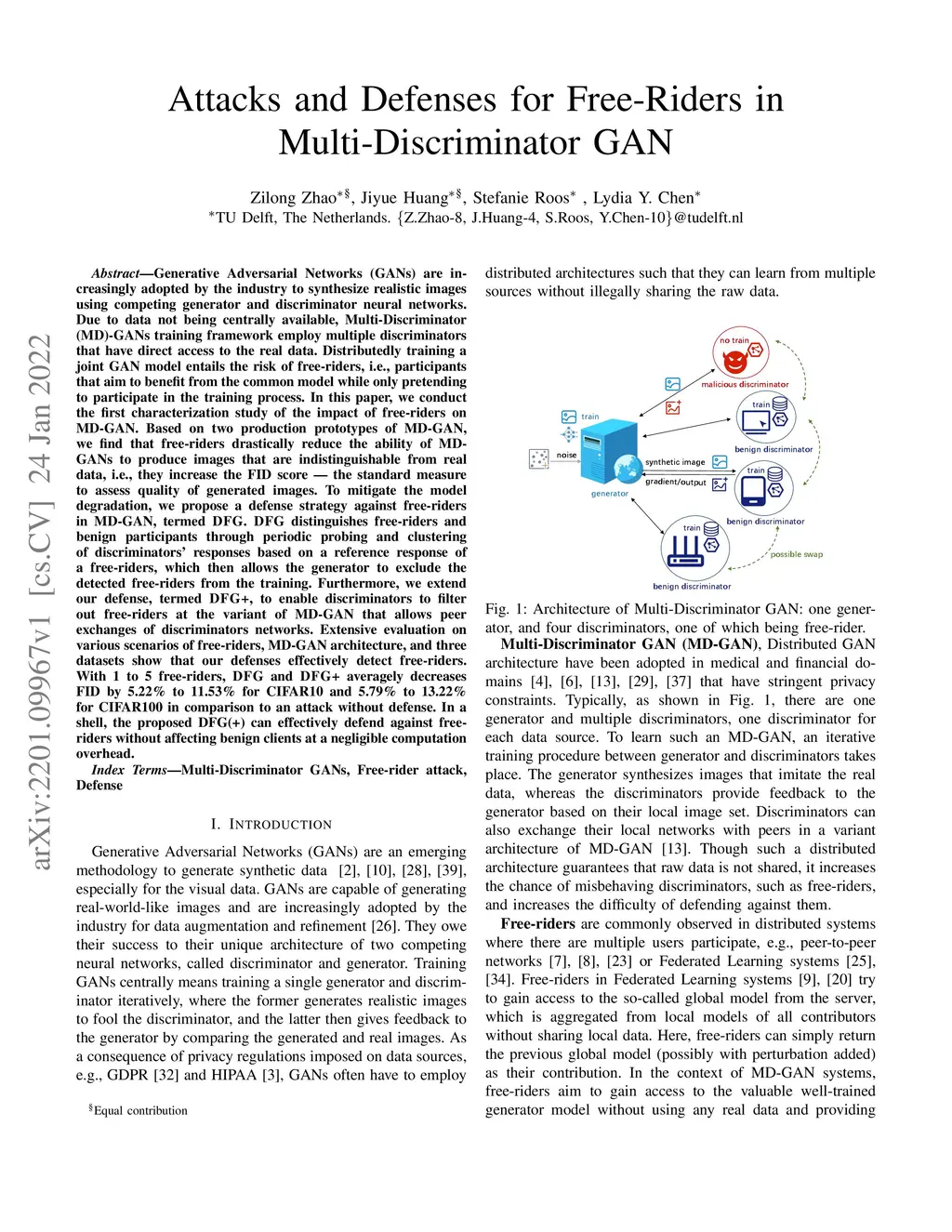 Attacks and Defenses for Free-Riders in Multi-Discriminator GAN