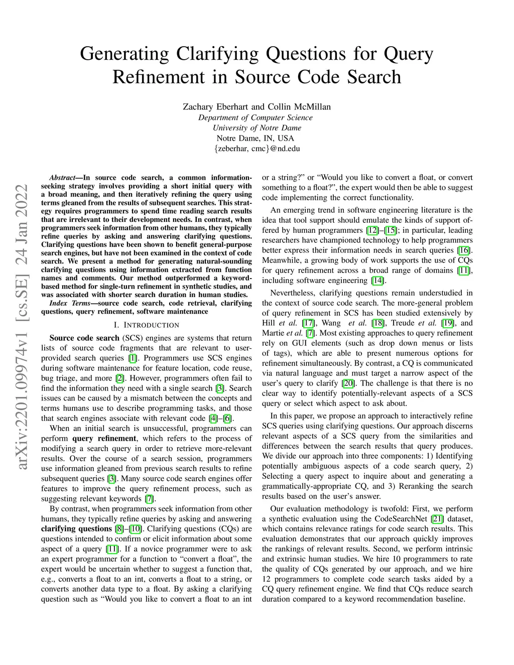 In source code search, a common information-seeking strategy involves providing a short initial query with a broad meaning, and then iteratively refining the query using terms gleaned from the results of subsequent searches. This strategy requires programmers to spend time reading search results that are irrelevant to their development needs. In contrast, when programmers seek information from other humans, they typically refine queries by asking and answering clarifying questions. Clarifying questions have been shown to benefit general-purpose search engines, but have not been examined in the context of code search. We present a method for generating natural-sounding clarifying questions using information extracted from function names and comments. Our method outperformed a keyword-based method for single-turn refinement in synthetic studies, and was associated with shorter search duration in human studies.