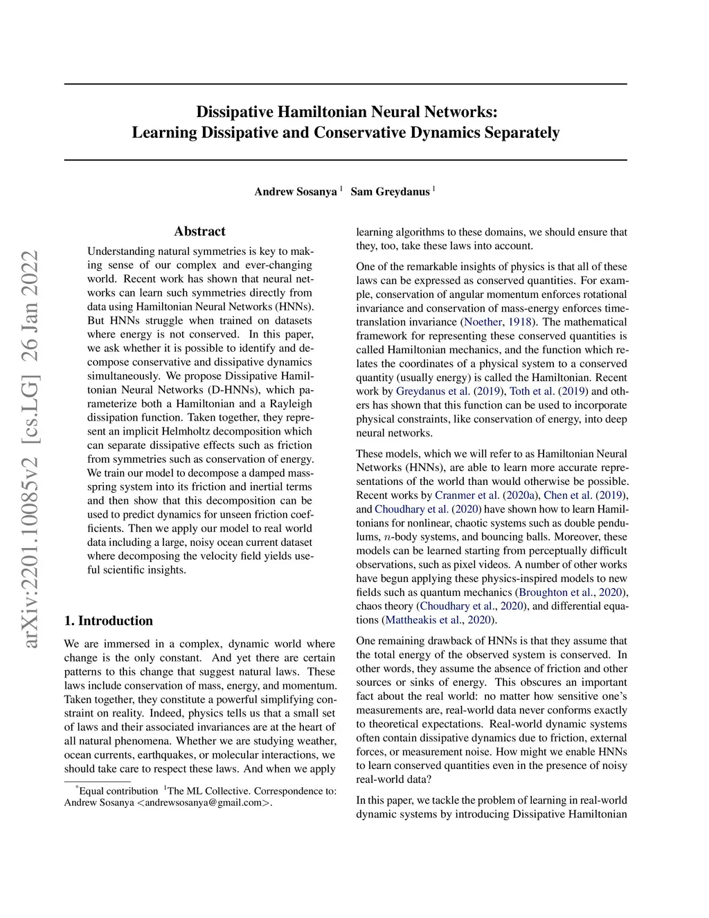 Understanding natural symmetries is key to making sense of our complex and ever-changing world. Recent work has shown that neural networks can learn such symmetries directly from data using Hamiltonian Neural Networks (HNNs). But HNNs struggle when trained on datasets where energy is not conserved. In this paper, we ask whether it is possible to identify and decompose conservative and dissipative dynamics simultaneously. We propose Dissipative Hamiltonian Neural Networks (D-HNNs), which parameterize both a Hamiltonian and a Rayleigh dissipation function. Taken together, they represent an implicit Helmholtz decomposition which can separate dissipative effects such as friction from symmetries such as conservation of energy. We train our model to decompose a damped mass-spring system into its friction and inertial terms and then show that this decomposition can be used to predict dynamics for unseen friction coefficients. Then we apply our model to real world data including a large, noisy ocean current dataset where decomposing the velocity field yields useful scientific insights.