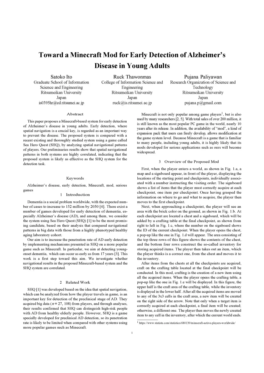 Toward a Minecraft Mod for Early Detection of Alzheimer's Disease in