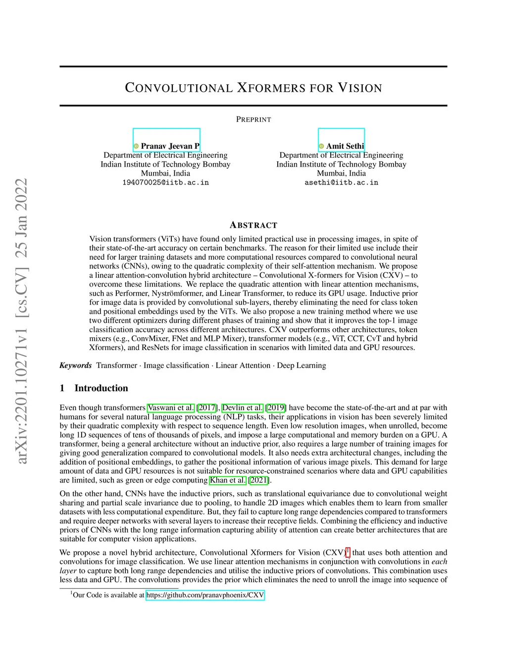 Vision transformers (ViTs) have found only limited practical use in processing images, in spite of their state-of-the-art accuracy on certain benchmarks. The reason for their limited use include their need for larger training datasets and more computational resources compared to convolutional neural networks (CNNs), owing to the quadratic complexity of their self-attention mechanism. We propose a linear attention-convolution hybrid architecture -- Convolutional X-formers for Vision (CXV) -- to overcome these limitations. We replace the quadratic attention with linear attention mechanisms, such as Performer, Nystr\"omformer, and Linear Transformer, to reduce its GPU usage. Inductive prior for image data is provided by convolutional sub-layers, thereby eliminating the need for class token and positional embeddings used by the ViTs. We also propose a new training method where we use two different optimizers during different phases of training and show that it improves the top-1 image classification accuracy across different architectures. CXV outperforms other architectures, token mixers (e.g. ConvMixer, FNet and MLP Mixer), transformer models (e.g. ViT, CCT, CvT and hybrid Xformers), and ResNets for image classification in scenarios with limited data and GPU resources (cores, RAM, power).
