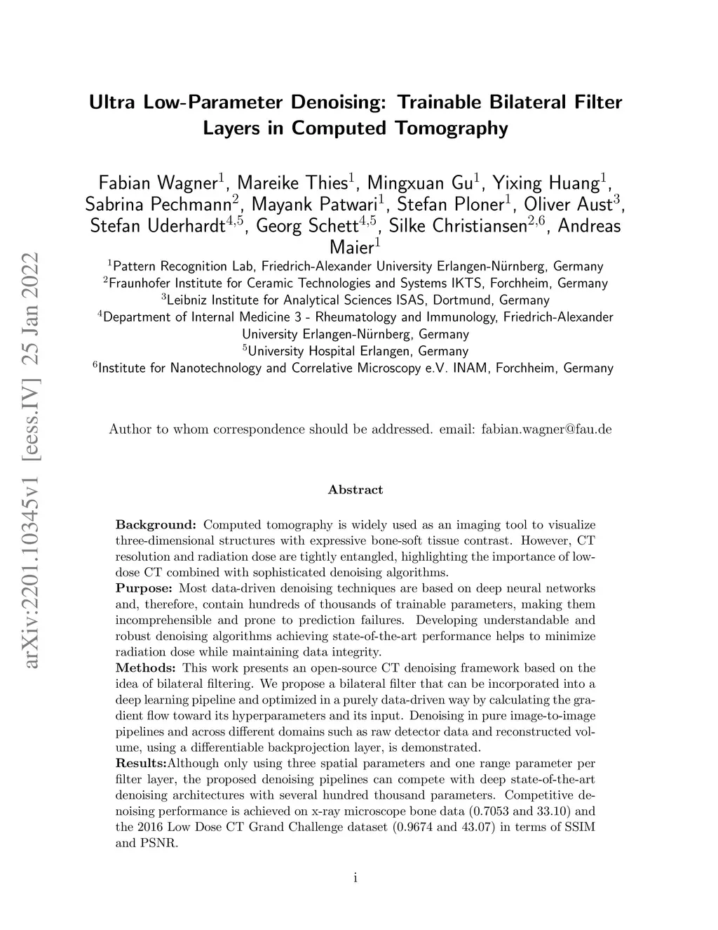 Computed tomography is widely used as an imaging tool to visualize three-dimensional structures with expressive bone-soft tissue contrast. However, CT resolution and radiation dose are tightly entangled, highlighting the importance of low-dose CT combined with sophisticated denoising algorithms. Most data-driven denoising techniques are based on deep neural networks and, therefore, contain hundreds of thousands of trainable parameters, making them incomprehensible and prone to prediction failures. Developing understandable and robust denoising algorithms achieving state-of-the-art performance helps to minimize radiation dose while maintaining data integrity. This work presents an open-source CT denoising framework based on the idea of bilateral filtering. We propose a bilateral filter that can be incorporated into a deep learning pipeline and optimized in a purely data-driven way by calculating the gradient flow toward its hyperparameters and its input. Denoising in pure image-to-image pipelines and across different domains such as raw detector data and reconstructed volume, using a differentiable backprojection layer, is demonstrated. Although only using three spatial parameters and one range parameter per filter layer, the proposed denoising pipelines can compete with deep state-of-the-art denoising architectures with several hundred thousand parameters. Competitive denoising performance is achieved on x-ray microscope bone data (0.7053 and 33.10) and the 2016 Low Dose CT Grand Challenge dataset (0.9674 and 43.07) in terms of SSIM and PSNR. Due to the extremely low number of trainable parameters with well-defined effect, prediction reliance and data integrity is guaranteed at any time in the proposed pipelines, in contrast to most other deep learning-based denoising architectures.