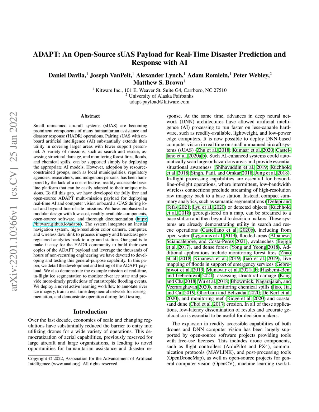 Small unmanned aircraft systems (sUAS) are becoming prominent components of many humanitarian assistance and disaster response (HADR) operations. Pairing sUAS with onboard artificial intelligence (AI) substantially extends their utility in covering larger areas with fewer support personnel. A variety of missions, such as search and rescue, assessing structural damage, and monitoring forest fires, floods, and chemical spills, can be supported simply by deploying the appropriate AI models. However, adoption by resource-constrained groups, such as local municipalities, regulatory agencies, and researchers, has been hampered by the lack of a cost-effective, readily-accessible baseline platform that can be adapted to their unique missions. To fill this gap, we have developed the free and open-source ADAPT multi-mission payload for deploying real-time AI and computer vision onboard a sUAS during local and beyond-line-of-site missions. We have emphasized a modular design with low-cost, readily-available components, open-source software, and thorough documentation (https://kitware.github.io/adapt/). The system integrates an inertial navigation system, high-resolution color camera, computer, and wireless downlink to process imagery and broadcast georegistered analytics back to a ground station. Our goal is to make it easy for the HADR community to build their own copies of the ADAPT payload and leverage the thousands of hours of engineering we have devoted to developing and testing. In this paper, we detail the development and testing of the ADAPT payload. We demonstrate the example mission of real-time, in-flight ice segmentation to monitor river ice state and provide timely predictions of catastrophic flooding events. We deploy a novel active learning workflow to annotate river ice imagery, train a real-time deep neural network for ice segmentation, and demonstrate operation in the field.