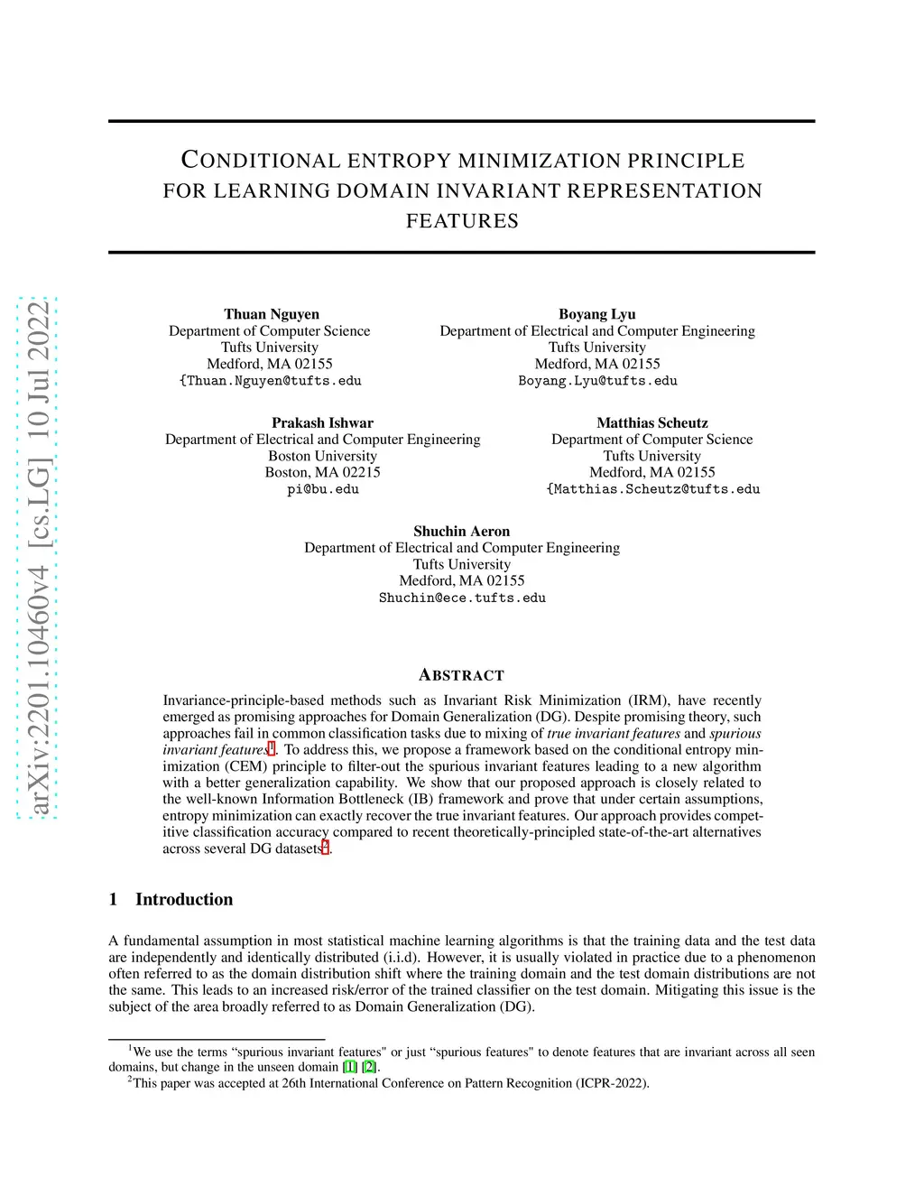 Invariance-principle-based methods such as Invariant Risk Minimization (IRM), have recently emerged as promising approaches for Domain Generalization (DG). Despite promising theory, such approaches fail in common classification tasks due to the mixing of true invariant features and spurious invariant features. To address this, we propose a framework based on the conditional entropy minimization (CEM) principle to filter-out the spurious invariant features leading to a new algorithm with a better generalization capability. We show that our proposed approach is closely related to the well-known Information Bottleneck (IB) framework and prove that under certain assumptions, entropy minimization can exactly recover the true invariant features. Our approach provides competitive classification accuracy compared to recent theoretically-principled state-of-the-art alternatives across several DG datasets.