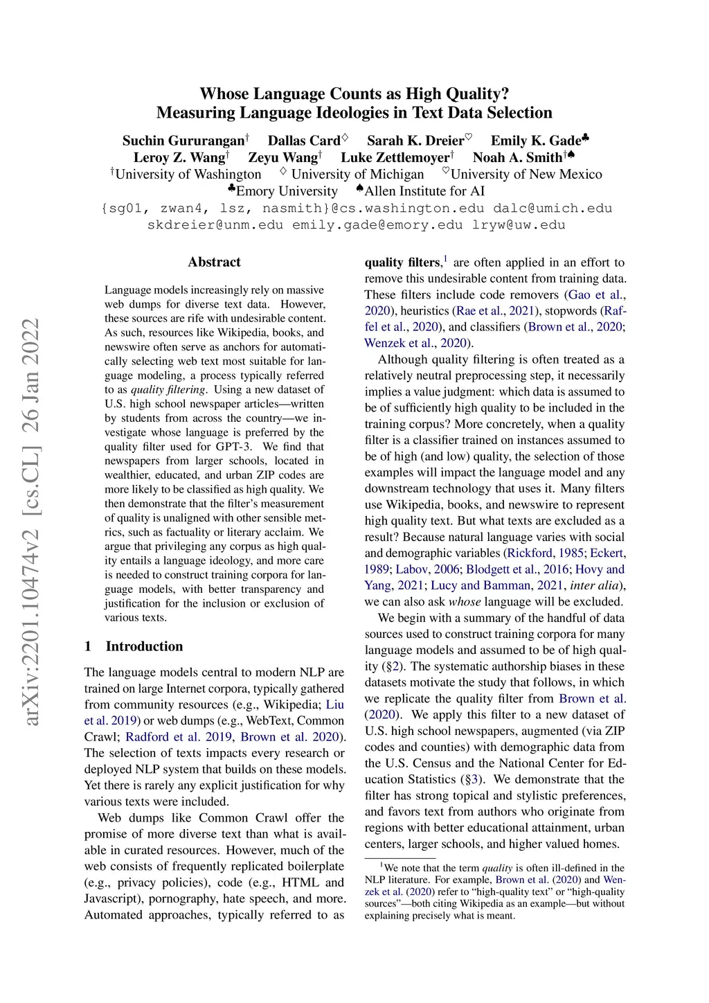 Language models increasingly rely on massive web dumps for diverse text data. However, these sources are rife with undesirable content. As such, resources like Wikipedia, books, and newswire often serve as anchors for automatically selecting web text most suitable for language modeling, a process typically referred to as quality filtering. Using a new dataset of U.S. high school newspaper articles -- written by students from across the country -- we investigate whose language is preferred by the quality filter used for GPT-3. We find that newspapers from larger schools, located in wealthier, educated, and urban ZIP codes are more likely to be classified as high quality. We then demonstrate that the filter's measurement of quality is unaligned with other sensible metrics, such as factuality or literary acclaim. We argue that privileging any corpus as high quality entails a language ideology, and more care is needed to construct training corpora for language models, with better transparency and justification for the inclusion or exclusion of various texts.
