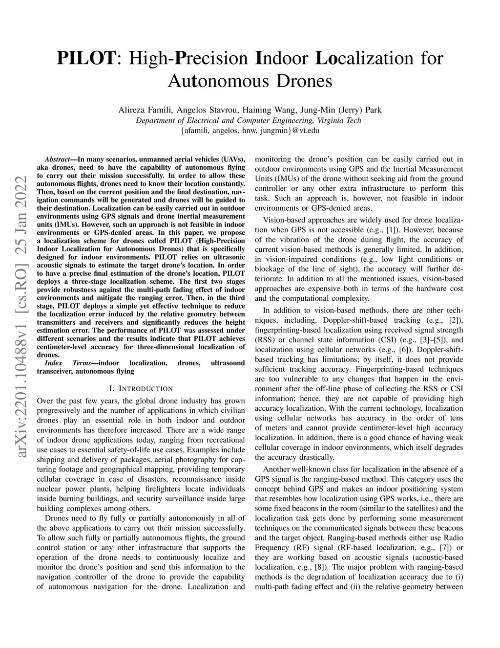 In many scenarios, unmanned aerial vehicles (UAVs), aka drones, need to have the capability of autonomous flying to carry out their mission successfully. In order to allow these autonomous flights, drones need to know their location constantly. Then, based on the current position and the final destination, navigation commands will be generated and drones will be guided to their destination. Localization can be easily carried out in outdoor environments using GPS signals and drone inertial measurement units (IMUs). However, such an approach is not feasible in indoor environments or GPS-denied areas. In this paper, we propose a localization scheme for drones called PILOT (High-Precision Indoor Localization for Autonomous Drones) that is specifically designed for indoor environments. PILOT relies on ultrasonic acoustic signals to estimate the target drone's location. In order to have a precise final estimation of the drone's location, PILOT deploys a three-stage localization scheme. The first two stages provide robustness against the multi-path fading effect of indoor environments and mitigate the ranging error. Then, in the third stage, PILOT deploys a simple yet effective technique to reduce the localization error induced by the relative geometry between transmitters and receivers and significantly reduces the height estimation error. The performance of PILOT was assessed under different scenarios and the results indicate that PILOT achieves centimeter-level accuracy for three-dimensional localization of drones.