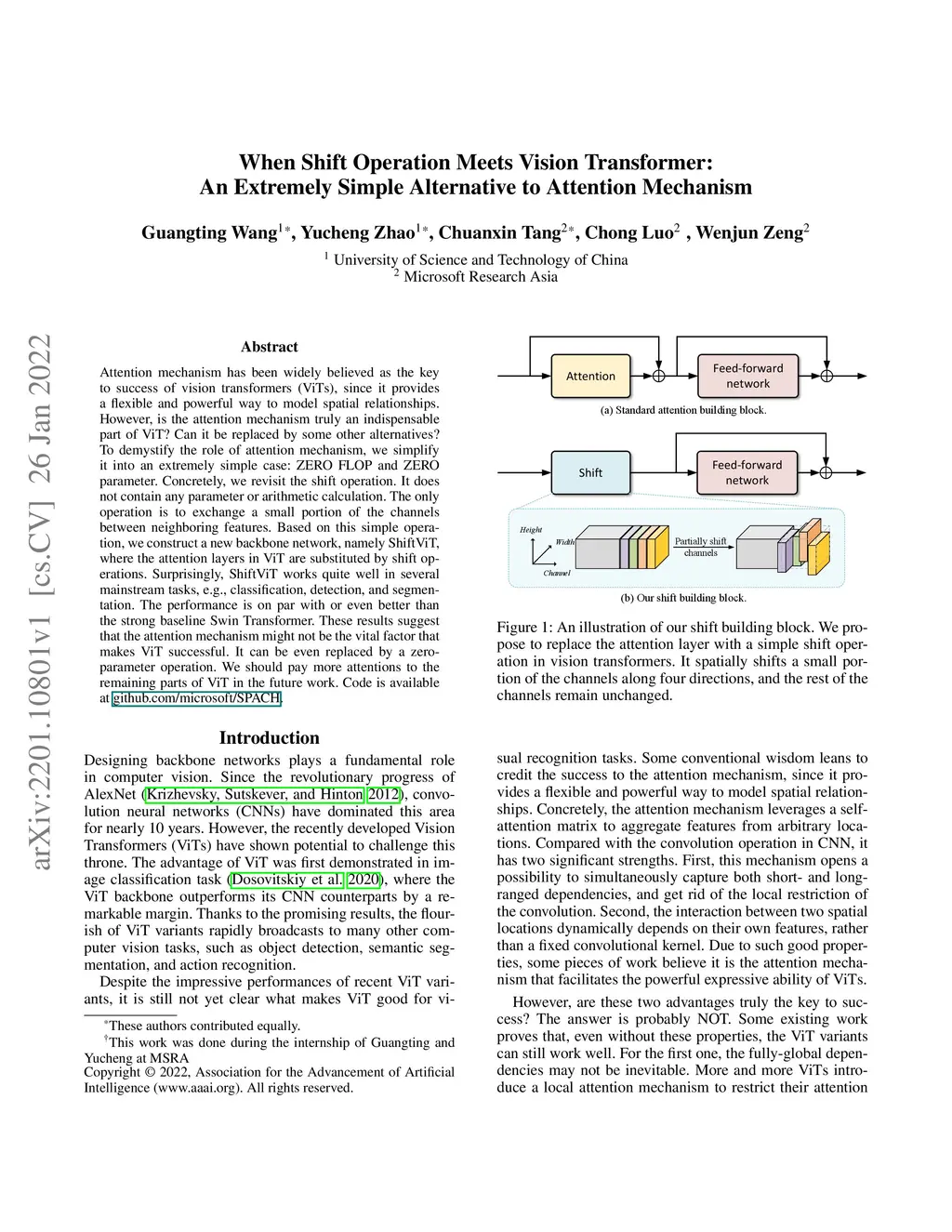 Attention mechanism has been widely believed as the key to success of vision transformers (ViTs), since it provides a flexible and powerful way to model spatial relationships. However, is the attention mechanism truly an indispensable part of ViT? Can it be replaced by some other alternatives? To demystify the role of attention mechanism, we simplify it into an extremely simple case: ZERO FLOP and ZERO parameter. Concretely, we revisit the shift operation. It does not contain any parameter or arithmetic calculation. The only operation is to exchange a small portion of the channels between neighboring features. Based on this simple operation, we construct a new backbone network, namely ShiftViT, where the attention layers in ViT are substituted by shift operations. Surprisingly, ShiftViT works quite well in several mainstream tasks, e.g., classification, detection, and segmentation. The performance is on par with or even better than the strong baseline Swin Transformer. These results suggest that the attention mechanism might not be the vital factor that makes ViT successful. It can be even replaced by a zero-parameter operation. We should pay more attentions to the remaining parts of ViT in the future work. Code is available at github.com/microsoft/SPACH.