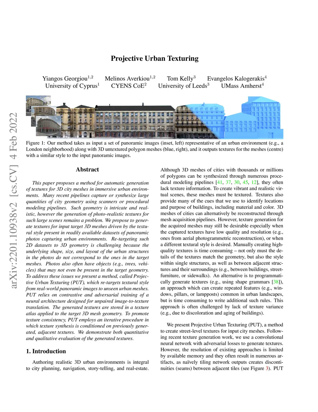 This paper proposes a method for automatic generation of textures for 3D city meshes in immersive urban environments. Many recent pipelines capture or synthesize large quantities of city geometry using scanners or procedural modeling pipelines. Such geometry is intricate and realistic, however the generation of photo-realistic textures for such large scenes remains a problem. We propose to generate textures for input target 3D meshes driven by the textural style present in readily available datasets of panoramic photos capturing urban environments. Re-targeting such 2D datasets to 3D geometry is challenging because the underlying shape, size, and layout of the urban structures in the photos do not correspond to the ones in the target meshes. Photos also often have objects (e.g., trees, vehicles) that may not even be present in the target geometry. To address these issues we present a method, called Projective Urban Texturing (PUT), which re-targets textural style from real-world panoramic images to unseen urban meshes. PUT relies on contrastive and adversarial training of a neural architecture designed for unpaired image-to-texture translation. The generated textures are stored in a texture atlas applied to the target 3D mesh geometry. To promote texture consistency, PUT employs an iterative procedure in which texture synthesis is conditioned on previously generated, adjacent textures. We demonstrate both quantitative and qualitative evaluation of the generated textures.