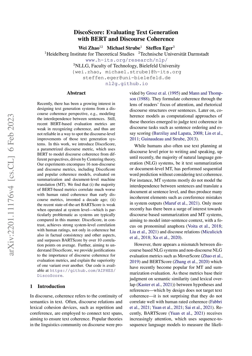 DiscoScore: Evaluating Text Generation with BERT and Discourse Coherence