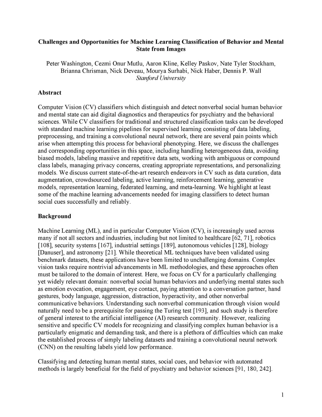 Computer Vision (CV) classifiers which distinguish and detect nonverbal social human behavior and mental state can aid digital diagnostics and therapeutics for psychiatry and the behavioral sciences. While CV classifiers for traditional and structured classification tasks can be developed with standard machine learning pipelines for supervised learning consisting of data labeling, preprocessing, and training a convolutional neural network, there are several pain points which arise when attempting this process for behavioral phenotyping. Here, we discuss the challenges and corresponding opportunities in this space, including handling heterogeneous data, avoiding biased models, labeling massive and repetitive data sets, working with ambiguous or compound class labels, managing privacy concerns, creating appropriate representations, and personalizing models. We discuss current state-of-the-art research endeavors in CV such as data curation, data augmentation, crowdsourced labeling, active learning, reinforcement learning, generative models, representation learning, federated learning, and meta-learning. We highlight at least some of the machine learning advancements needed for imaging classifiers to detect human social cues successfully and reliably.
