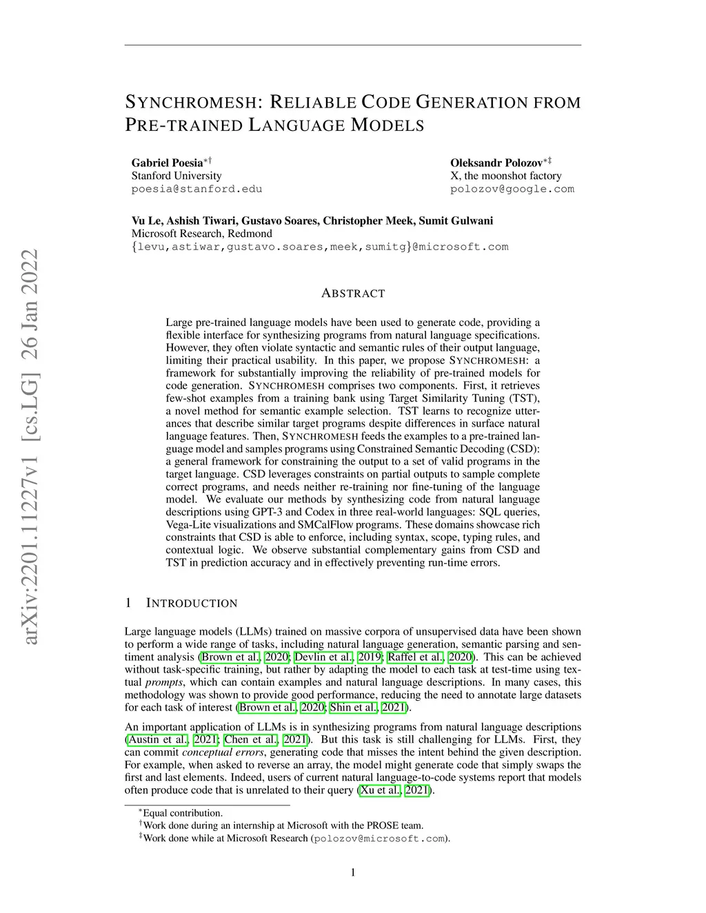 Large pre-trained language models have been used to generate code,providing a flexible interface for synthesizing programs from natural language specifications. However, they often violate syntactic and semantic rules of their output language, limiting their practical usability. In this paper, we propose Synchromesh: a framework for substantially improving the reliability of pre-trained models for code generation. Synchromesh comprises two components. First, it retrieves few-shot examples from a training bank using Target Similarity Tuning (TST), a novel method for semantic example selection. TST learns to recognize utterances that describe similar target programs despite differences in surface natural language features. Then, Synchromesh feeds the examples to a pre-trained language model and samples programs using Constrained Semantic Decoding (CSD): a general framework for constraining the output to a set of valid programs in the target language. CSD leverages constraints on partial outputs to sample complete correct programs, and needs neither re-training nor fine-tuning of the language model. We evaluate our methods by synthesizing code from natural language descriptions using GPT-3 and Codex in three real-world languages: SQL queries, Vega-Lite visualizations and SMCalFlow programs. These domains showcase rich constraints that CSD is able to enforce, including syntax, scope, typing rules, and contextual logic. We observe substantial complementary gains from CSD and TST in prediction accuracy and in effectively preventing run-time errors.