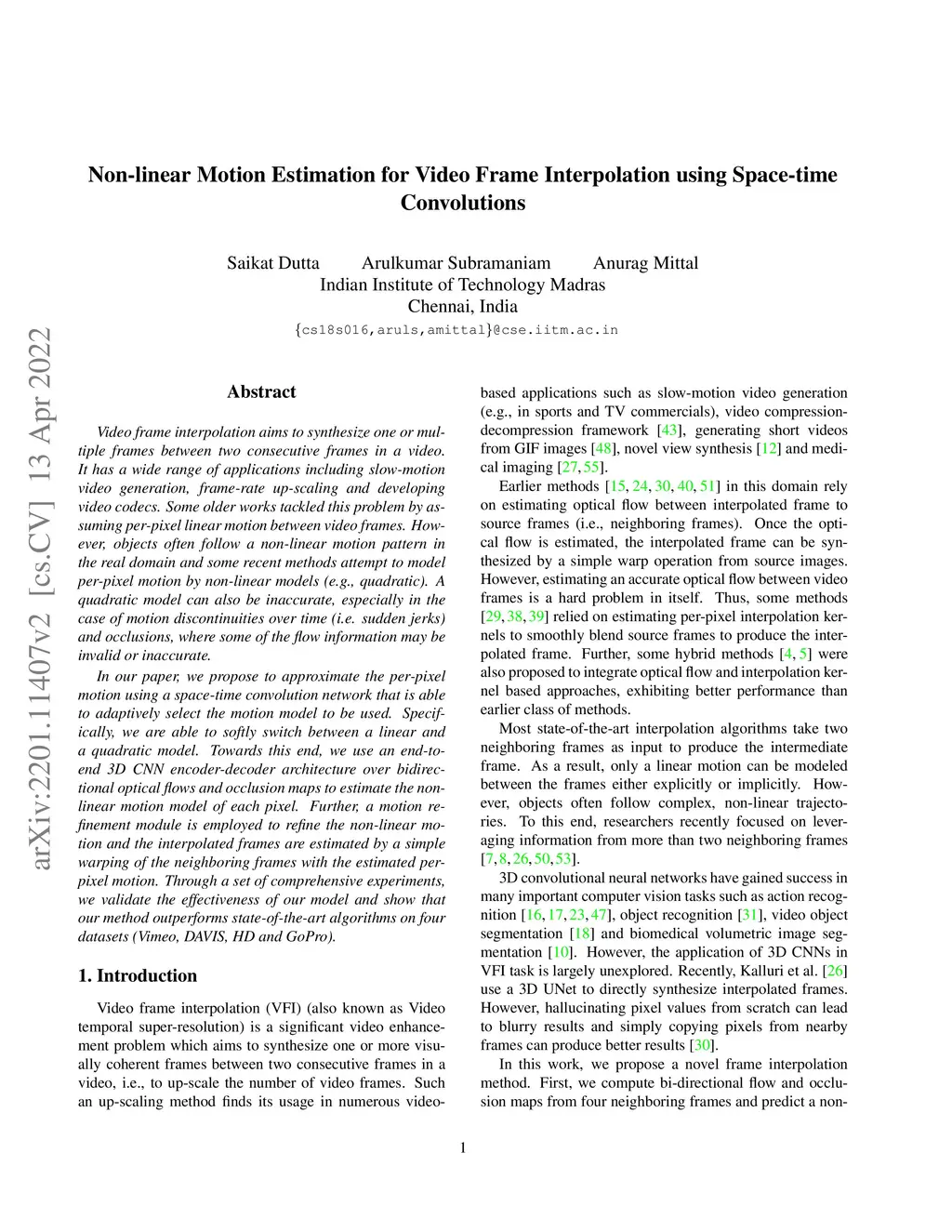 Video frame interpolation aims to synthesize one or multiple frames between two consecutive frames in a video. It has a wide range of applications including slow-motion video generation, frame-rate up-scaling and developing video codecs. Some older works tackled this problem by assuming per-pixel linear motion between video frames. However, objects often follow a non-linear motion pattern in the real domain and some recent methods attempt to model per-pixel motion by non-linear models (e.g., quadratic). A quadratic model can also be inaccurate, especially in the case of motion discontinuities over time (i.e. sudden jerks) and occlusions, where some of the flow information may be invalid or inaccurate. In our paper, we propose to approximate the per-pixel motion using a space-time convolution network that is able to adaptively select the motion model to be used. Specifically, we are able to softly switch between a linear and a quadratic model. Towards this end, we use an end-to-end 3D CNN encoder-decoder architecture over bidirectional optical flows and occlusion maps to estimate the non-linear motion model of each pixel. Further, a motion refinement module is employed to refine the non-linear motion and the interpolated frames are estimated by a simple warping of the neighboring frames with the estimated per-pixel motion. Through a set of comprehensive experiments, we validate the effectiveness of our model and show that our method outperforms state-of-the-art algorithms on four datasets (Vimeo, DAVIS, HD and GoPro).