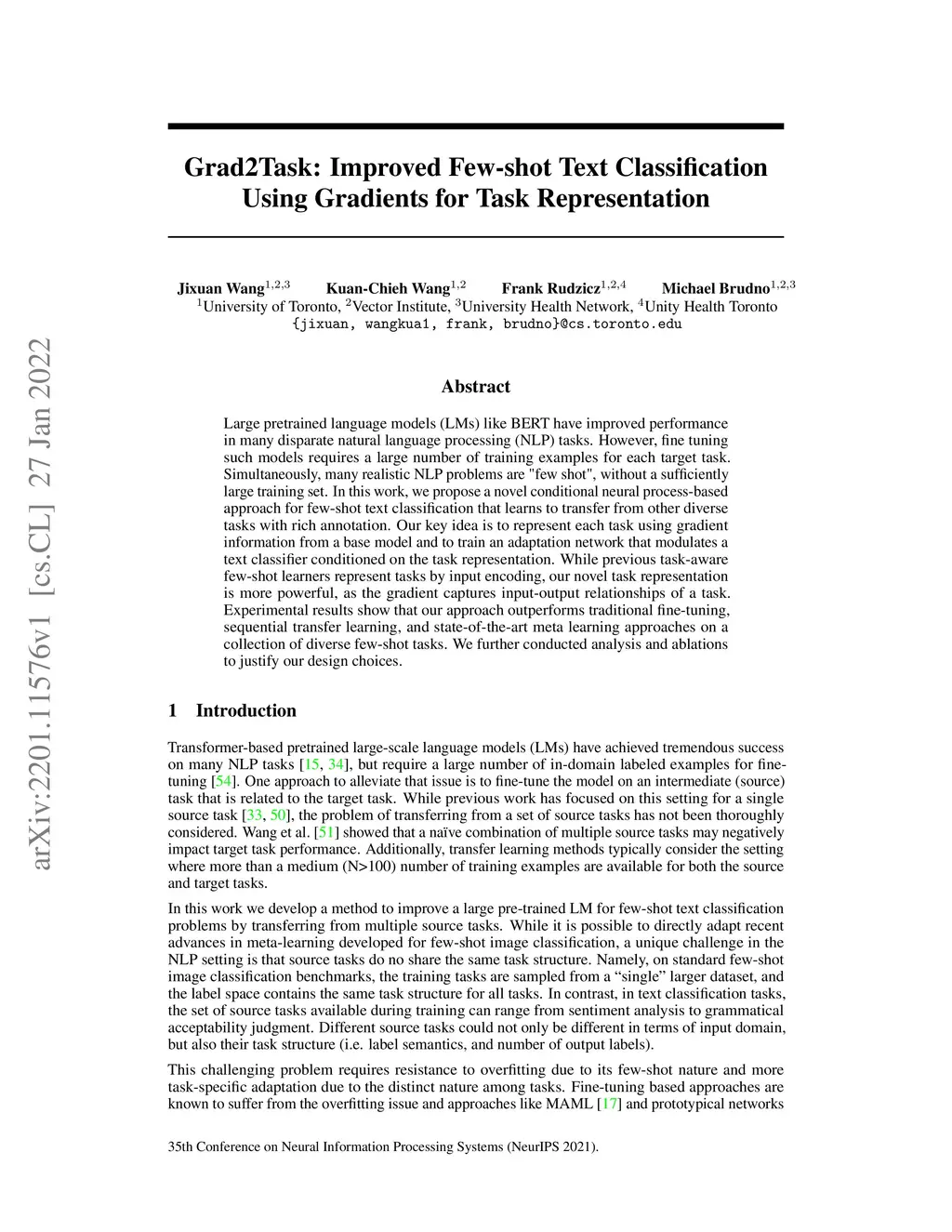 Large pretrained language models (LMs) like BERT have improved performance in many disparate natural language processing (NLP) tasks. However, fine tuning such models requires a large number of training examples for each target task. Simultaneously, many realistic NLP problems are "few shot", without a sufficiently large training set. In this work, we propose a novel conditional neural process-based approach for few-shot text classification that learns to transfer from other diverse tasks with rich annotation. Our key idea is to represent each task using gradient information from a base model and to train an adaptation network that modulates a text classifier conditioned on the task representation. While previous task-aware few-shot learners represent tasks by input encoding, our novel task representation is more powerful, as the gradient captures input-output relationships of a task. Experimental results show that our approach outperforms traditional fine-tuning, sequential transfer learning, and state-of-the-art meta learning approaches on a collection of diverse few-shot tasks. We further conducted analysis and ablations to justify our design choices.