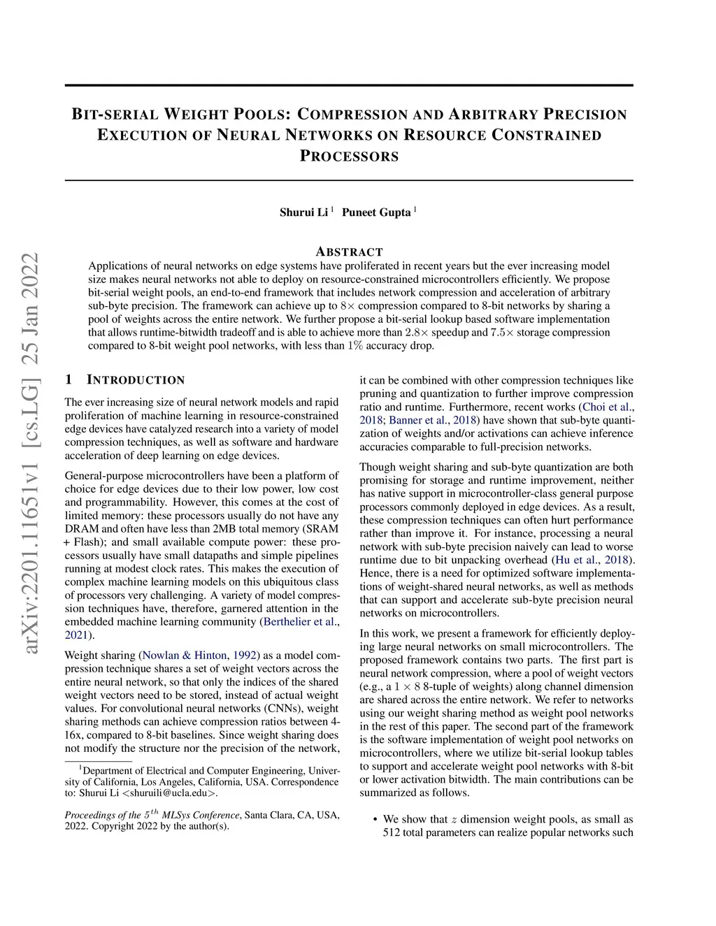 Applications of neural networks on edge systems have proliferated in recent years but the ever-increasing model size makes neural networks not able to deploy on resource-constrained microcontrollers efficiently. We propose bit-serial weight pools, an end-to-end framework that includes network compression and acceleration of arbitrary sub-byte precision. The framework can achieve up to 8x compression compared to 8-bit networks by sharing a pool of weights across the entire network. We further propose a bit-serial lookup based software implementation that allows runtime-bitwidth tradeoff and is able to achieve more than 2.8x speedup and 7.5x storage compression compared to 8-bit weight pool networks, with less than 1% accuracy drop.