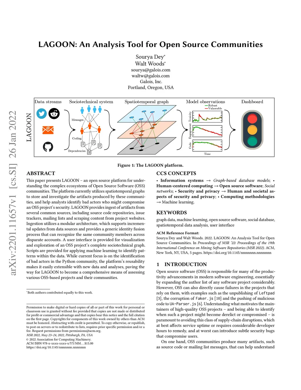 This paper presents LAGOON -- an open source platform for understanding the complex ecosystems of Open Source Software (OSS) communities. The platform currently utilizes spatiotemporal graphs to store and investigate the artifacts produced by these communities, and help analysts identify bad actors who might compromise an OSS project's security. LAGOON provides ingest of artifacts from several common sources, including source code repositories, issue trackers, mailing lists and scraping content from project websites. Ingestion utilizes a modular architecture, which supports incremental updates from data sources and provides a generic identity fusion process that can recognize the same community members across disparate accounts. A user interface is provided for visualization and exploration of an OSS project's complete sociotechnical graph. Scripts are provided for applying machine learning to identify patterns within the data. While current focus is on the identification of bad actors in the Python community, the platform's reusability makes it easily extensible with new data and analyses, paving the way for LAGOON to become a comprehensive means of assessing various OSS-based projects and their communities.