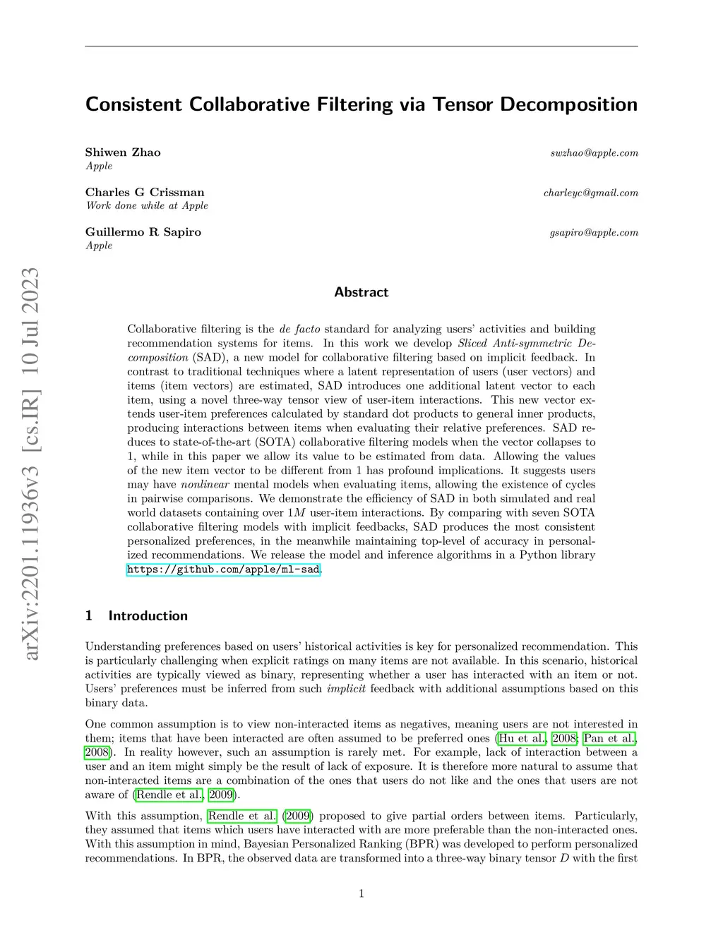 Collaborative filtering is the de facto standard for analyzing users' activities and building recommendation systems for items. In this work we develop Sliced Anti-symmetric Decomposition (SAD), a new model for collaborative filtering based on implicit feedback. In contrast to traditional techniques where a latent representation of users (user vectors) and items (item vectors) are estimated, SAD introduces one additional latent vector to each item, using a novel three-way tensor view of user-item interactions. This new vector extends user-item preferences calculated by standard dot products to general inner products, producing interactions between items when evaluating their relative preferences. SAD reduces to state-of-the-art (SOTA) collaborative filtering models when the vector collapses to 1, while in this paper we allow its value to be estimated from data. Allowing the values of the new item vector to be different from 1 has profound implications. It suggests users may have nonlinear mental models when evaluating items, allowing the existence of cycles in pairwise comparisons. We demonstrate the efficiency of SAD in both simulated and real world datasets containing over 1M user-item interactions. By comparing with seven SOTA collaborative filtering models with implicit feedbacks, SAD produces the most consistent personalized preferences, in the meanwhile maintaining top-level of accuracy in personalized recommendations. We release the model and inference algorithms in a Python library https://github.com/apple/ml-sad.