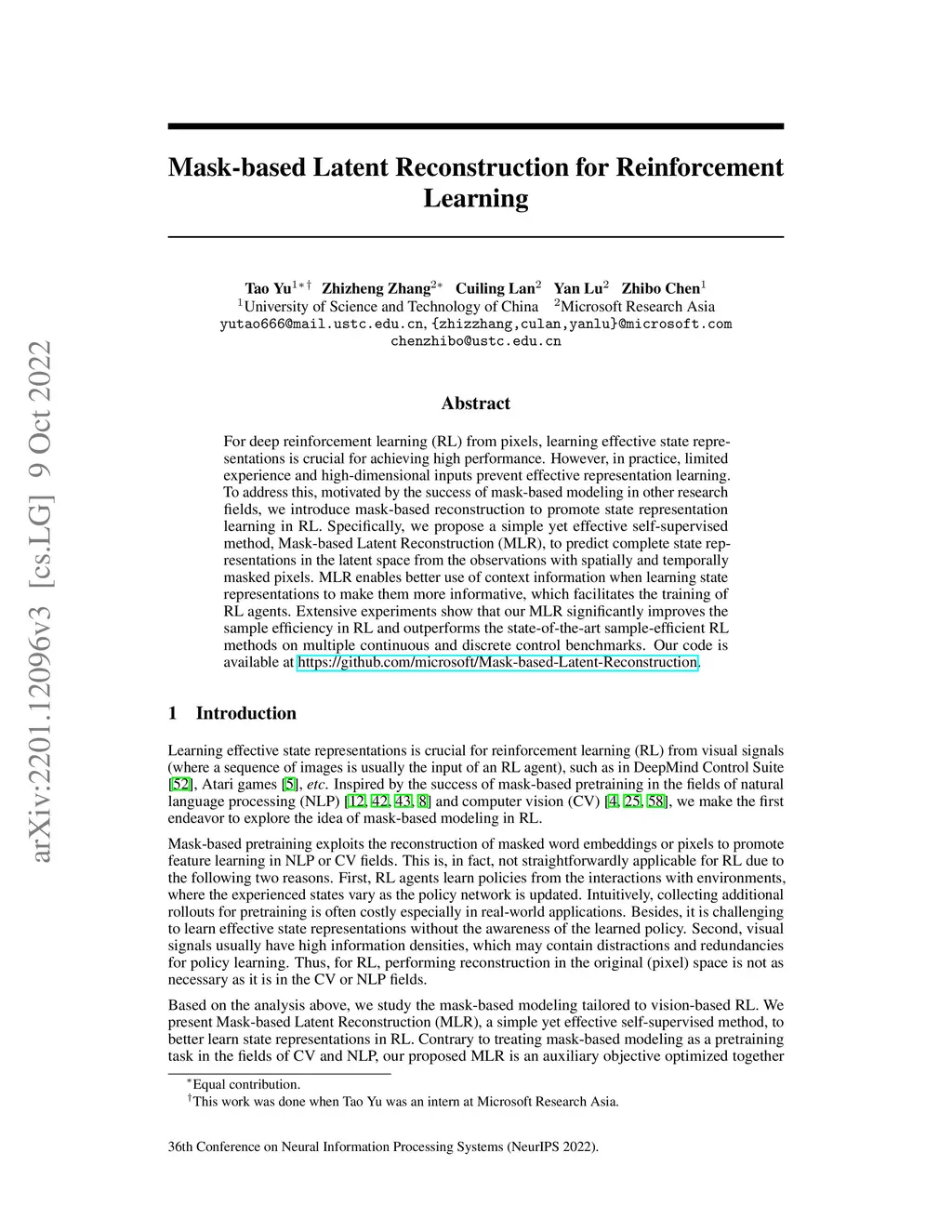 Mask-based Latent Reconstruction for Reinforcement Learning