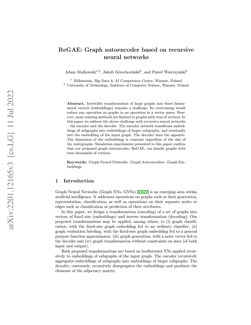 Invertible transformation of large graphs into fixed dimensional vectors (embeddings) remains a challenge. Its overcoming would reduce any operation on graphs to an operation in a vector space. However, most existing methods are limited to graphs with tens of vertices. In this paper we address the above challenge with recursive neural networks - the encoder and the decoder. The encoder network transforms embeddings of subgraphs into embeddings of larger subgraphs, and eventually into the embedding of the input graph. The decoder does the opposite. The dimension of the embeddings is constant regardless of the size of the (sub)graphs. Simulation experiments presented in this paper confirm that our proposed graph autoencoder, ReGAE, can handle graphs with even thousands of vertices.