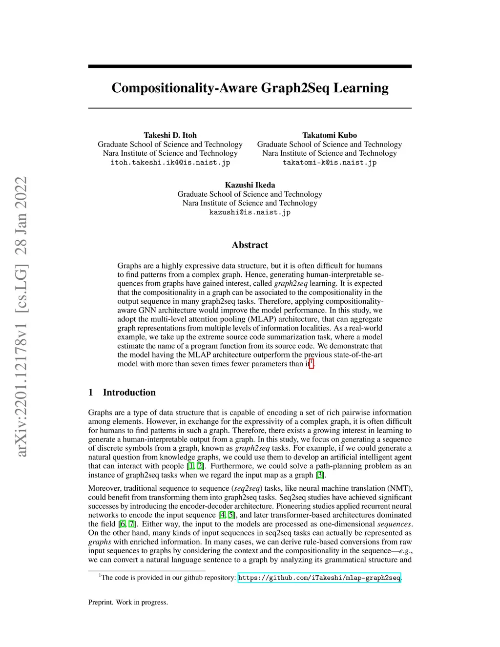 Graphs are a highly expressive data structure, but it is often difficult for humans to find patterns from a complex graph. Hence, generating human-interpretable sequences from graphs have gained interest, called graph2seq learning. It is expected that the compositionality in a graph can be associated to the compositionality in the output sequence in many graph2seq tasks. Therefore, applying compositionality-aware GNN architecture would improve the model performance. In this study, we adopt the multi-level attention pooling (MLAP) architecture, that can aggregate graph representations from multiple levels of information localities. As a real-world example, we take up the extreme source code summarization task, where a model estimate the name of a program function from its source code. We demonstrate that the model having the MLAP architecture outperform the previous state-of-the-art model with more than seven times fewer parameters than it.