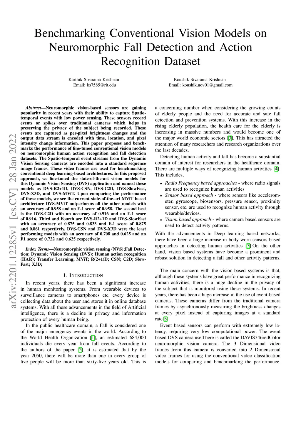 Neuromorphic vision-based sensors are gaining popularity in recent years with their ability to capture Spatio-temporal events with low power sensing. These sensors record events or spikes over traditional cameras which helps in preserving the privacy of the subject being recorded. These events are captured as per-pixel brightness changes and the output data stream is encoded with time, location, and pixel intensity change information. This paper proposes and benchmarks the performance of fine-tuned conventional vision models on neuromorphic human action recognition and fall detection datasets. The Spatio-temporal event streams from the Dynamic Vision Sensing cameras are encoded into a standard sequence image frames. These video frames are used for benchmarking conventional deep learning-based architectures. In this proposed approach, we fine-tuned the state-of-the-art vision models for this Dynamic Vision Sensing (DVS) application and named these models as DVS-R2+1D, DVS-CSN, DVS-C2D, DVS-SlowFast, DVS-X3D, and DVS-MViT. Upon comparing the performance of these models, we see the current state-of-the-art MViT based architecture DVS-MViT outperforms all the other models with an accuracy of 0.958 and an F-1 score of 0.958. The second best is the DVS-C2D with an accuracy of 0.916 and an F-1 score of 0.916. Third and Fourth are DVS-R2+1D and DVS-SlowFast with an accuracy of 0.875 and 0.833 and F-1 score of 0.875 and 0.861 respectively. DVS-CSN and DVS-X3D were the least performing models with an accuracy of 0.708 and 0.625 and an F1 score of 0.722 and 0.625 respectively.