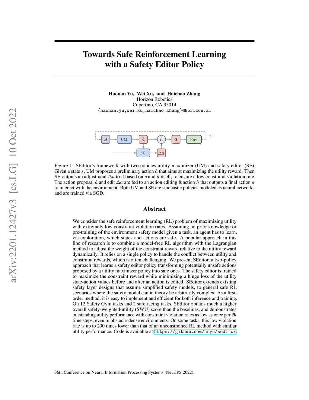Towards Safe Reinforcement Learning with a Safety Editor Policy