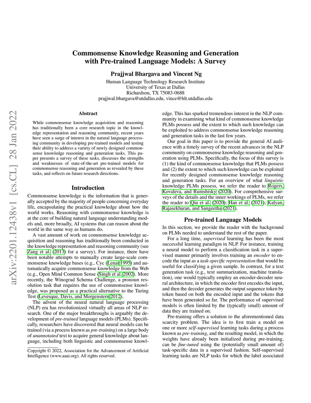 While commonsense knowledge acquisition and reasoning has traditionally been a core research topic in the knowledge representation and reasoning community, recent years have seen a surge of interest in the natural language processing community in developing pre-trained models and testing their ability to address a variety of newly designed commonsense knowledge reasoning and generation tasks. This paper presents a survey of these tasks, discusses the strengths and weaknesses of state-of-the-art pre-trained models for commonsense reasoning and generation as revealed by these tasks, and reflects on future research directions.