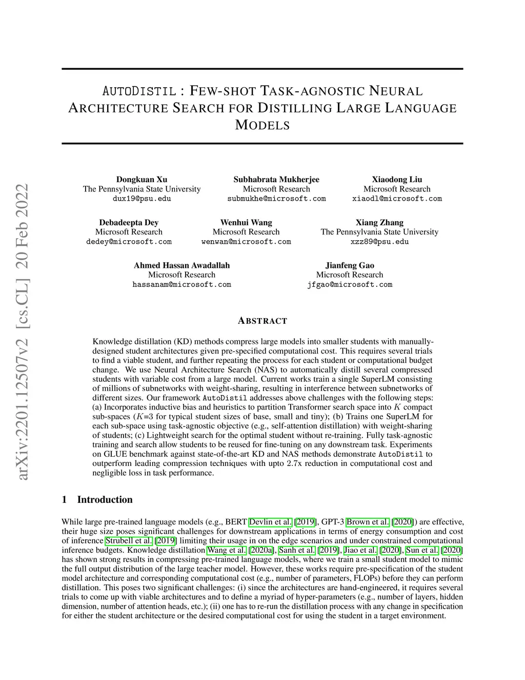 Knowledge distillation (KD) methods compress large models into smaller students with manually-designed student architectures given pre-specified computational cost. This requires several trials to find a viable student, and further repeating the process for each student or computational budget change. We use Neural Architecture Search (NAS) to automatically distill several compressed students with variable cost from a large model. Current works train a single SuperLM consisting of millions of subnetworks with weight-sharing, resulting in interference between subnetworks of different sizes. Our framework AutoDistil addresses above challenges with the following steps: (a) Incorporates inductive bias and heuristics to partition Transformer search space into K compact sub-spaces (K=3 for typical student sizes of base, small and tiny); (b) Trains one SuperLM for each sub-space using task-agnostic objective (e.g., self-attention distillation) with weight-sharing of students; (c) Lightweight search for the optimal student without re-training. Fully task-agnostic training and search allow students to be reused for fine-tuning on any downstream task. Experiments on GLUE benchmark against state-of-the-art KD and NAS methods demonstrate AutoDistil to outperform leading compression techniques with upto 2.7x reduction in computational cost and negligible loss in task performance.