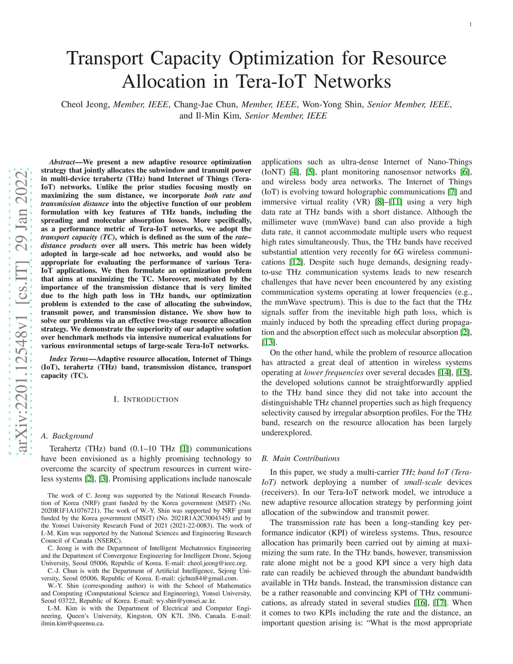 We present a new adaptive resource optimization strategy that jointly allocates the subwindow and transmit power in multi-device terahertz (THz) band Internet of Things (Tera-IoT) networks. Unlike the prior studies focusing mostly on maximizing the sum distance, we incorporate both rate and transmission distance into the objective function of our problem formulation with key features of THz bands, including the spreading and molecular absorption losses. More specifically, as a performance metric of Tera-IoT networks, we adopt the transport capacity (TC), which is defined as the sum of the rate-distance products over all users. This metric has been widely adopted in large-scale ad hoc networks, and would also be appropriate for evaluating the performance of various Tera-IoT applications. We then formulate an optimization problem that aims at maximizing the TC. Moreover, motivated by the importance of the transmission distance that is very limited due to the high path loss in THz bands, our optimization problem is extended to the case of allocating the subwindow, transmit power, and transmission distance. We show how to solve our problems via an effective two-stage resource allocation strategy. We demonstrate the superiority of our adaptive solution over benchmark methods via intensive numerical evaluations for various environmental setups of large-scale Tera-IoT networks.