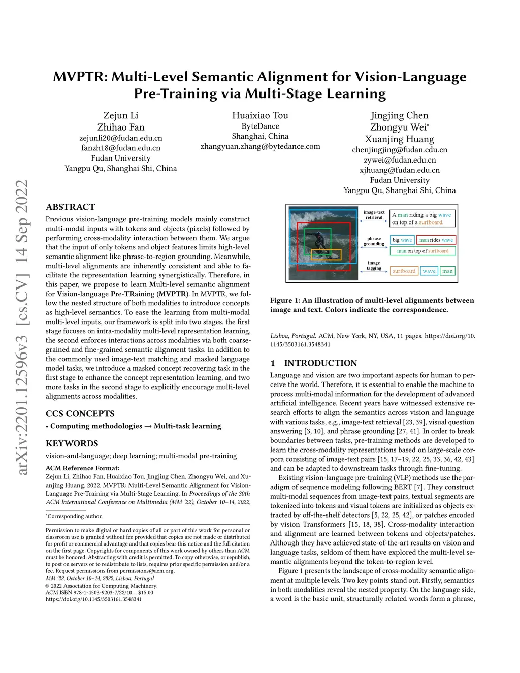 Previous vision-language pre-training models mainly construct multi-modal inputs with tokens and objects (pixels) followed by performing cross-modality interaction between them. We argue that the input of only tokens and object features limits high-level semantic alignment like phrase-to-region grounding. Meanwhile, multi-level alignments are inherently consistent and able to facilitate the representation learning synergistically. Therefore, in this paper, we propose to learn Multi-level semantic alignment for Vision-language Pre-TRaining (MVPTR). In MVPTR, we follow the nested structure of both modalities to introduce concepts as high-level semantics. To ease the learning from multi-modal multi-level inputs, our framework is split into two stages, the first stage focuses on intra-modality multi-level representation learning, the second enforces interactions across modalities via both coarse-grained and fine-grained semantic alignment tasks. In addition to the commonly used image-text matching and masked language model tasks, we introduce a masked concept recovering task in the first stage to enhance the concept representation learning, and two more tasks in the second stage to explicitly encourage multi-level alignments across modalities. Our code is available at https://github.com/Junction4Nako/mvp_pytorch.