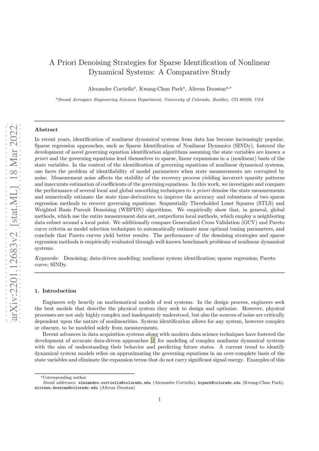In recent years, identification of nonlinear dynamical systems from data has become increasingly popular. Sparse regression approaches, such as Sparse Identification of Nonlinear Dynamics (SINDy), fostered the development of novel governing equation identification algorithms assuming the state variables are known a priori and the governing equations lend themselves to sparse, linear expansions in a (nonlinear) basis of the state variables. In the context of the identification of governing equations of nonlinear dynamical systems, one faces the problem of identifiability of model parameters when state measurements are corrupted by noise. Measurement noise affects the stability of the recovery process yielding incorrect sparsity patterns and inaccurate estimation of coefficients of the governing equations. In this work, we investigate and compare the performance of several local and global smoothing techniques to a priori denoise the state measurements and numerically estimate the state time-derivatives to improve the accuracy and robustness of two sparse regression methods to recover governing equations: Sequentially Thresholded Least Squares (STLS) and Weighted Basis Pursuit Denoising (WBPDN) algorithms. We empirically show that, in general, global methods, which use the entire measurement data set, outperform local methods, which employ a neighboring data subset around a local point. We additionally compare Generalized Cross Validation (GCV) and Pareto curve criteria as model selection techniques to automatically estimate near optimal tuning parameters, and conclude that Pareto curves yield better results. The performance of the denoising strategies and sparse regression methods is empirically evaluated through well-known benchmark problems of nonlinear dynamical systems.