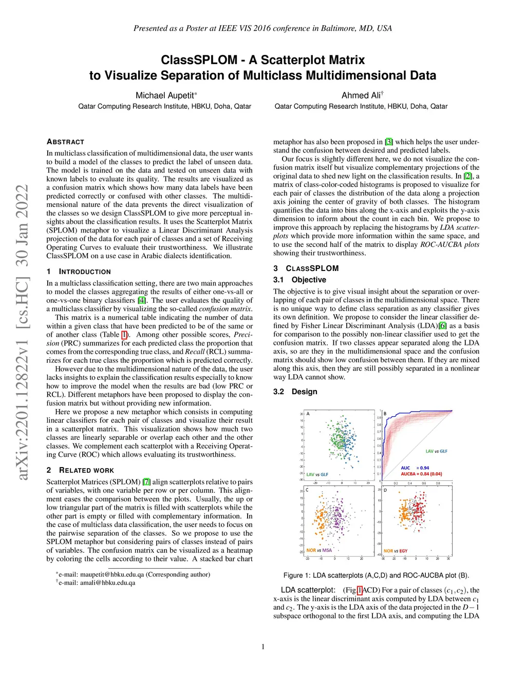 In multiclass classification of multidimensional data, the user wants to build a model of the classes to predict the label of unseen data. The model is trained on the data and tested on unseen data with known labels to evaluate its quality. The results are visualized as a confusion matrix which shows how many data labels have been predicted correctly or confused with other classes. The multidimensional nature of the data prevents the direct visualization of the classes so we design ClassSPLOM to give more perceptual insights about the classification results. It uses the Scatterplot Matrix (SPLOM) metaphor to visualize a Linear Discriminant Analysis projection of the data for each pair of classes and a set of Receiving Operating Curves to evaluate their trustworthiness. We illustrate ClassSPLOM on a use case in Arabic dialects identification.