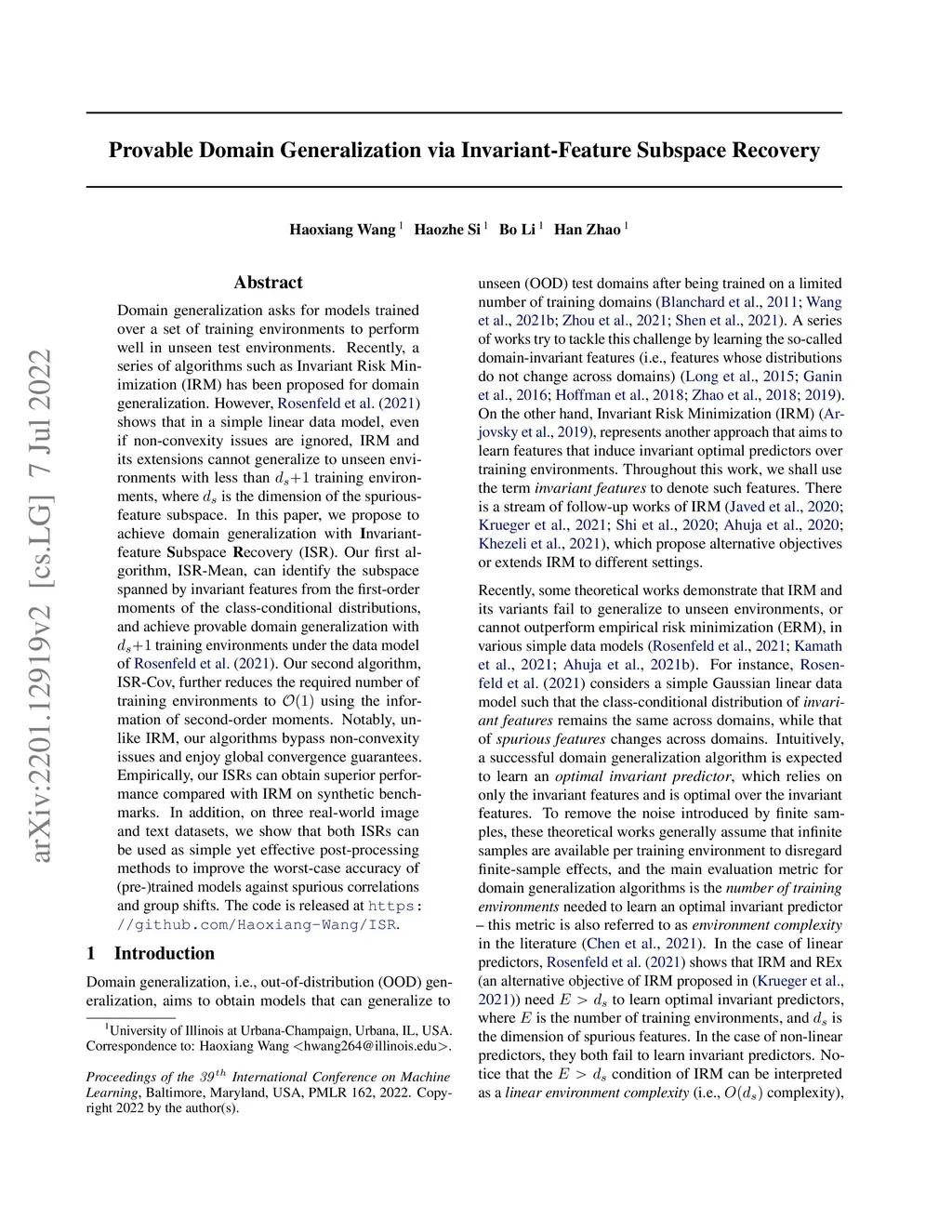 Provable Domain Generalization via Invariant-Feature Subspace Recovery