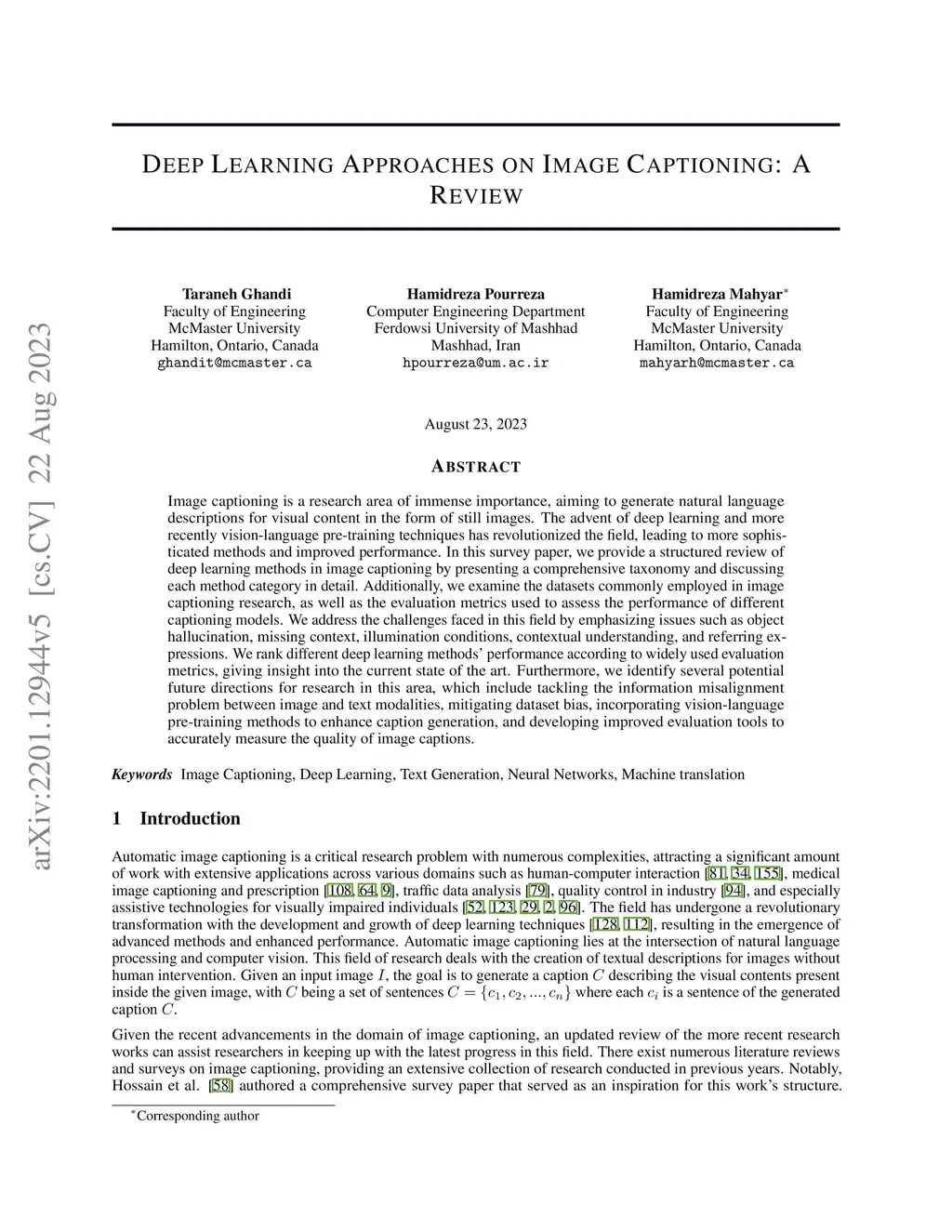 Image captioning is a research area of immense importance, aiming to generate natural language descriptions for visual content in the form of still images. The advent of deep learning and more recently vision-language pre-training techniques has revolutionized the field, leading to more sophisticated methods and improved performance. In this survey paper, we provide a structured review of deep learning methods in image captioning by presenting a comprehensive taxonomy and discussing each method category in detail. Additionally, we examine the datasets commonly employed in image captioning research, as well as the evaluation metrics used to assess the performance of different captioning models. We address the challenges faced in this field by emphasizing issues such as object hallucination, missing context, illumination conditions, contextual understanding, and referring expressions. We rank different deep learning methods' performance according to widely used evaluation metrics, giving insight into the current state of the art. Furthermore, we identify several potential future directions for research in this area, which include tackling the information misalignment problem between image and text modalities, mitigating dataset bias, incorporating vision-language pre-training methods to enhance caption generation, and developing improved evaluation tools to accurately measure the quality of image captions.