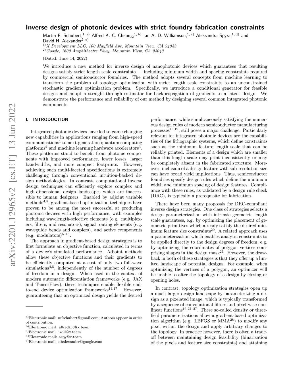 We introduce a new method for inverse design of nanophotonic devices which guarantees that resulting designs satisfy strict length scale constraints - including minimum width and spacing constraints required by commercial semiconductor foundries. The method adopts several concepts from machine learning to transform the problem of topology optimization with strict length scale constraints to an unconstrained stochastic gradient optimization problem. Specifically, we introduce a conditional generator for feasible designs and adopt a straight-through estimator for backpropagation of gradients to a latent design. We demonstrate the performance and reliability of our method by designing several common integrated photonic components.