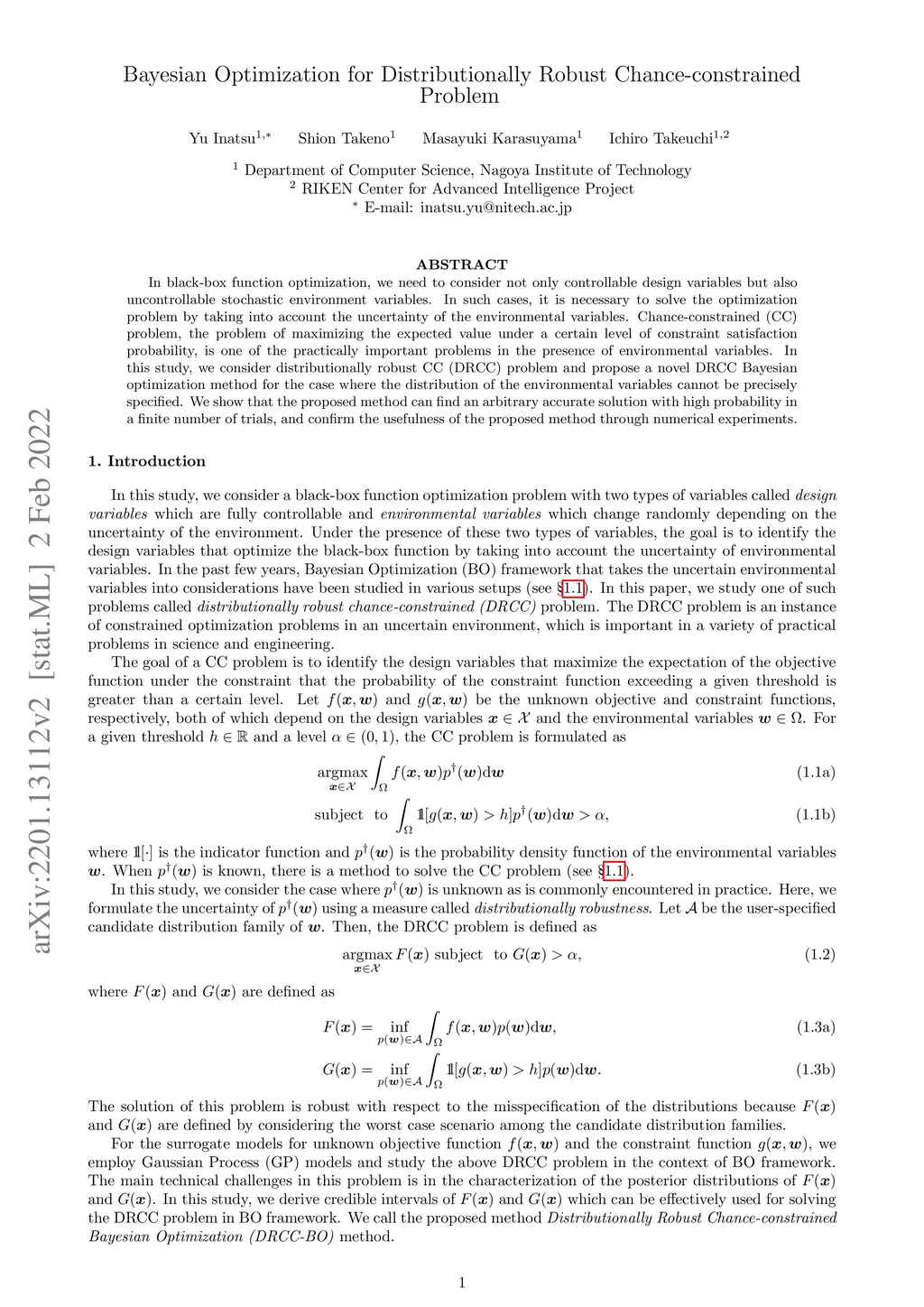 In black-box function optimization, we need to consider not only controllable design variables but also uncontrollable stochastic environment variables. In such cases, it is necessary to solve the optimization problem by taking into account the uncertainty of the environmental variables. Chance-constrained (CC) problem, the problem of maximizing the expected value under a certain level of constraint satisfaction probability, is one of the practically important problems in the presence of environmental variables. In this study, we consider distributionally robust CC (DRCC) problem and propose a novel DRCC Bayesian optimization method for the case where the distribution of the environmental variables cannot be precisely specified. We show that the proposed method can find an arbitrary accurate solution with high probability in a finite number of trials, and confirm the usefulness of the proposed method through numerical experiments.