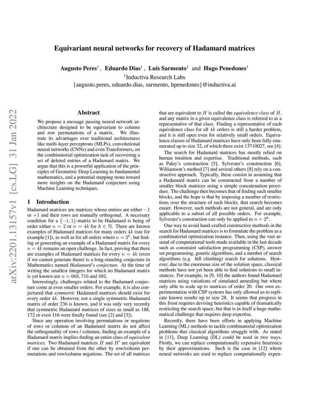 We propose a message passing neural network architecture designed to be equivariant to column and row permutations of a matrix. We illustrate its advantages over traditional architectures like multi-layer perceptrons (MLPs), convolutional neural networks (CNNs) and even Transformers, on the combinatorial optimization task of recovering a set of deleted entries of a Hadamard matrix. We argue that this is a powerful application of the principles of Geometric Deep Learning to fundamental mathematics, and a potential stepping stone toward more insights on the Hadamard conjecture using Machine Learning techniques.