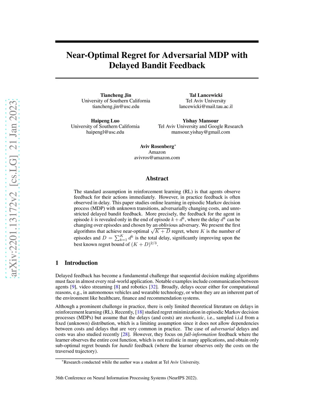 Near-Optimal Regret for Adversarial MDP with Delayed Bandit Feedback